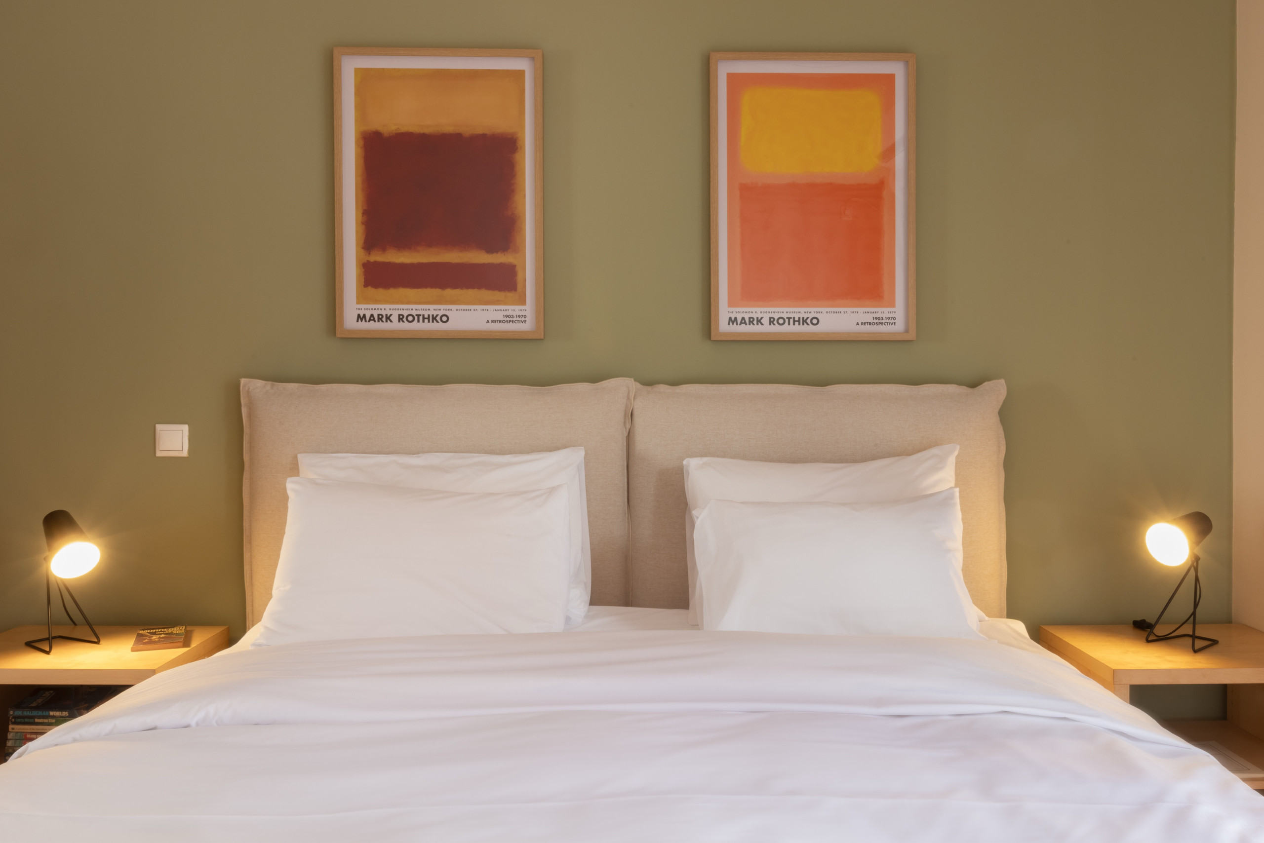 Our apartment can sleep up to four people. There is a chic double bedroom, a comfortable-sized living room with a dining table and a sofa bed, a kitchenette, and a bathroom. The double bedroom boasts a luxurious Sealy mattress, offering high-quality comfort during your stay.