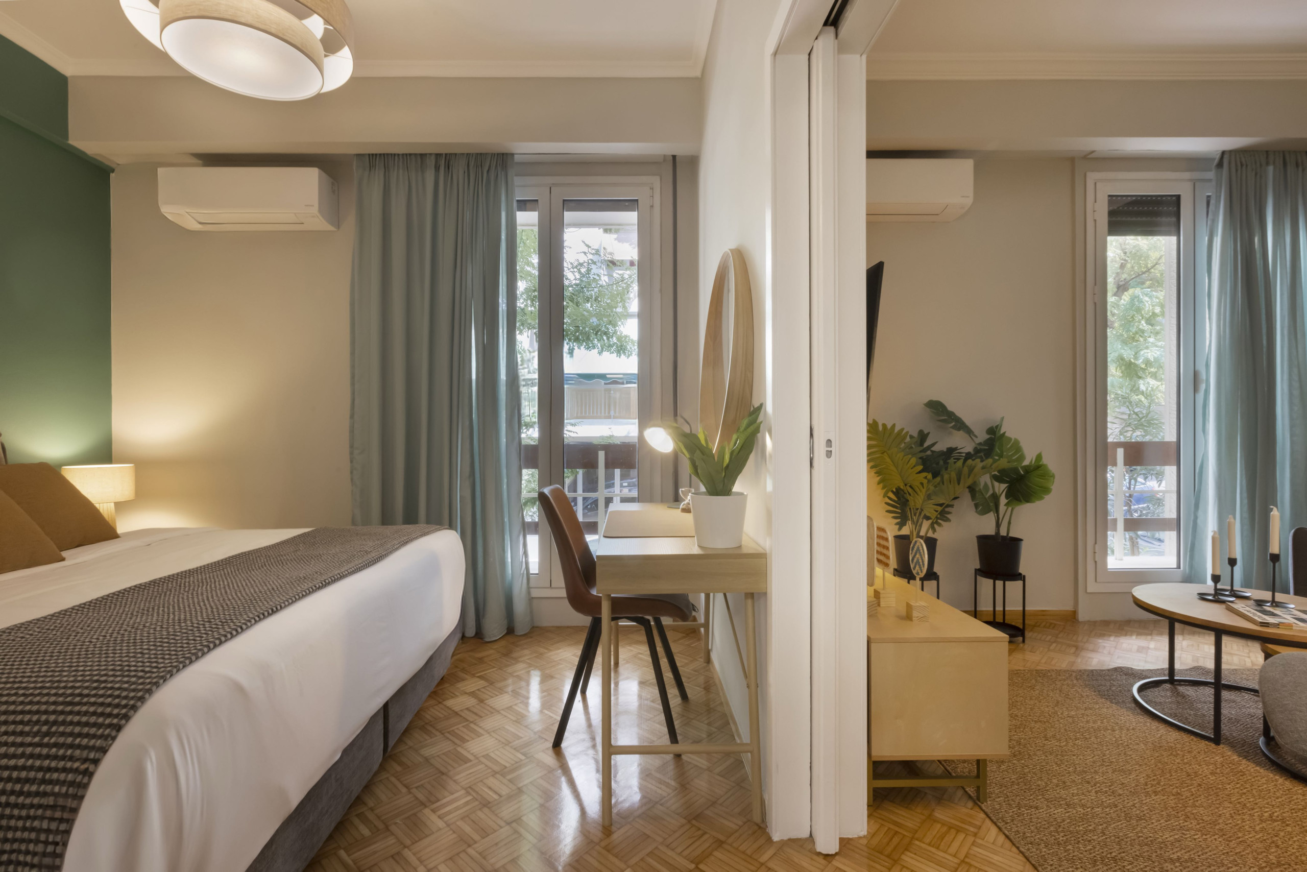 Immerse yourself in understated elegance at this large, newly renovated studio in Pagrati. With its sleek lines, soothing tones, and designer touches, it’s a calm retreat in the heart of the city. Perfect for two guests who value space, comfort, and style.