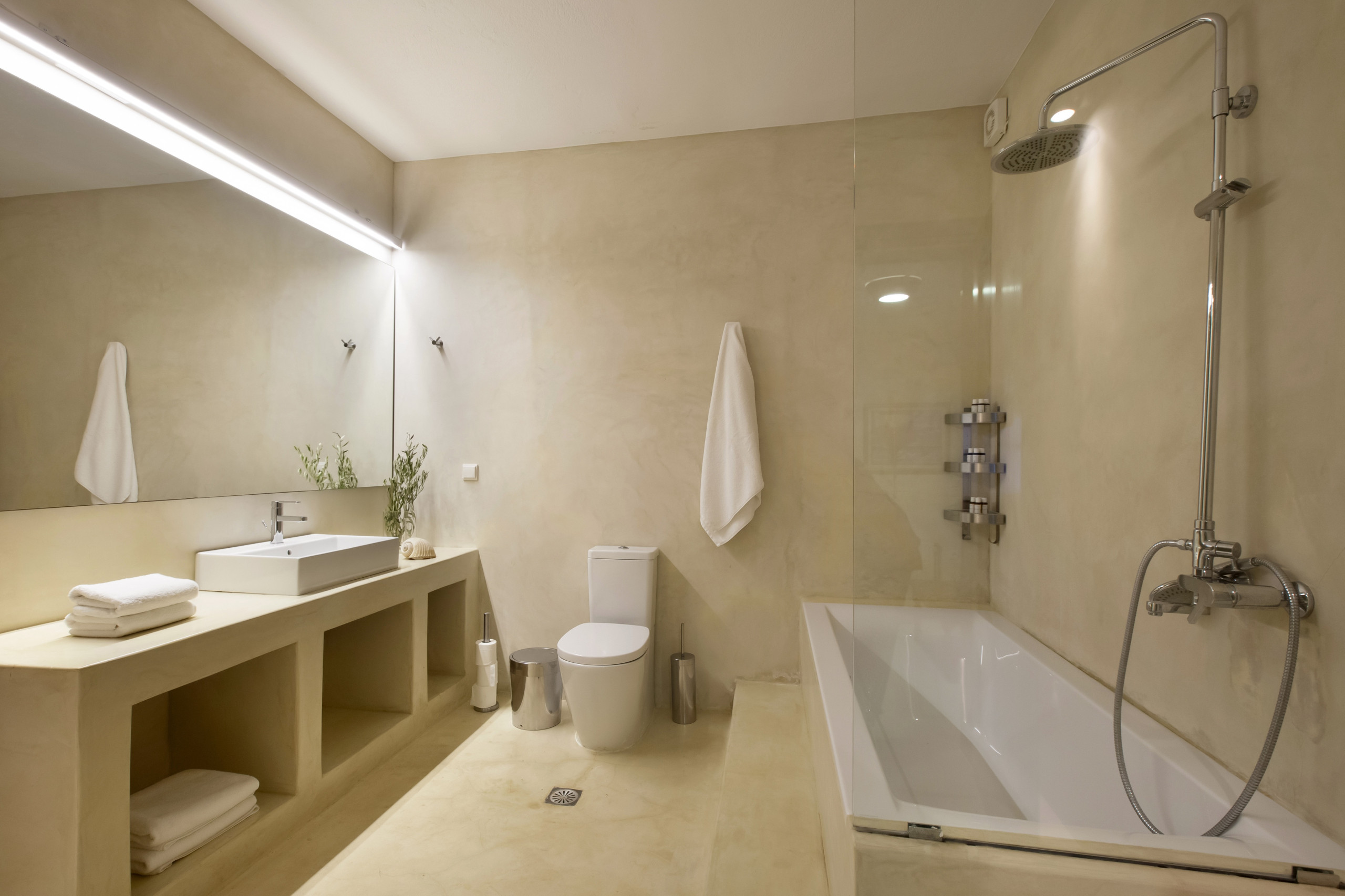 The bedrooms are very spacious and look out onto the garden and the sea. All four have double beds. One of our bathrooms has a large bath tub and all come with modern showers.