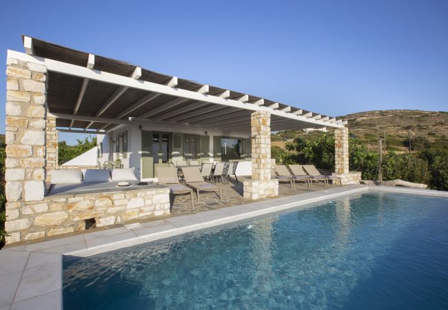 Anemos is the essential upmarket Paros pool villa. A beautiful family residence with stunning sea views and a large garden, it has many shaded areas outdoors for the whole party to wine and dine alfresco. Two gorgeous beaches are just a few steps away. Up to 8 guests can enjoy this private pool villa very comfortably.