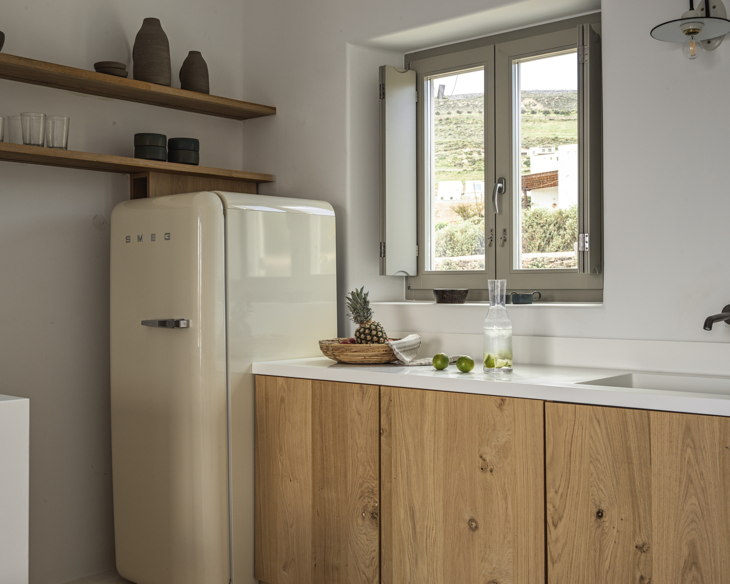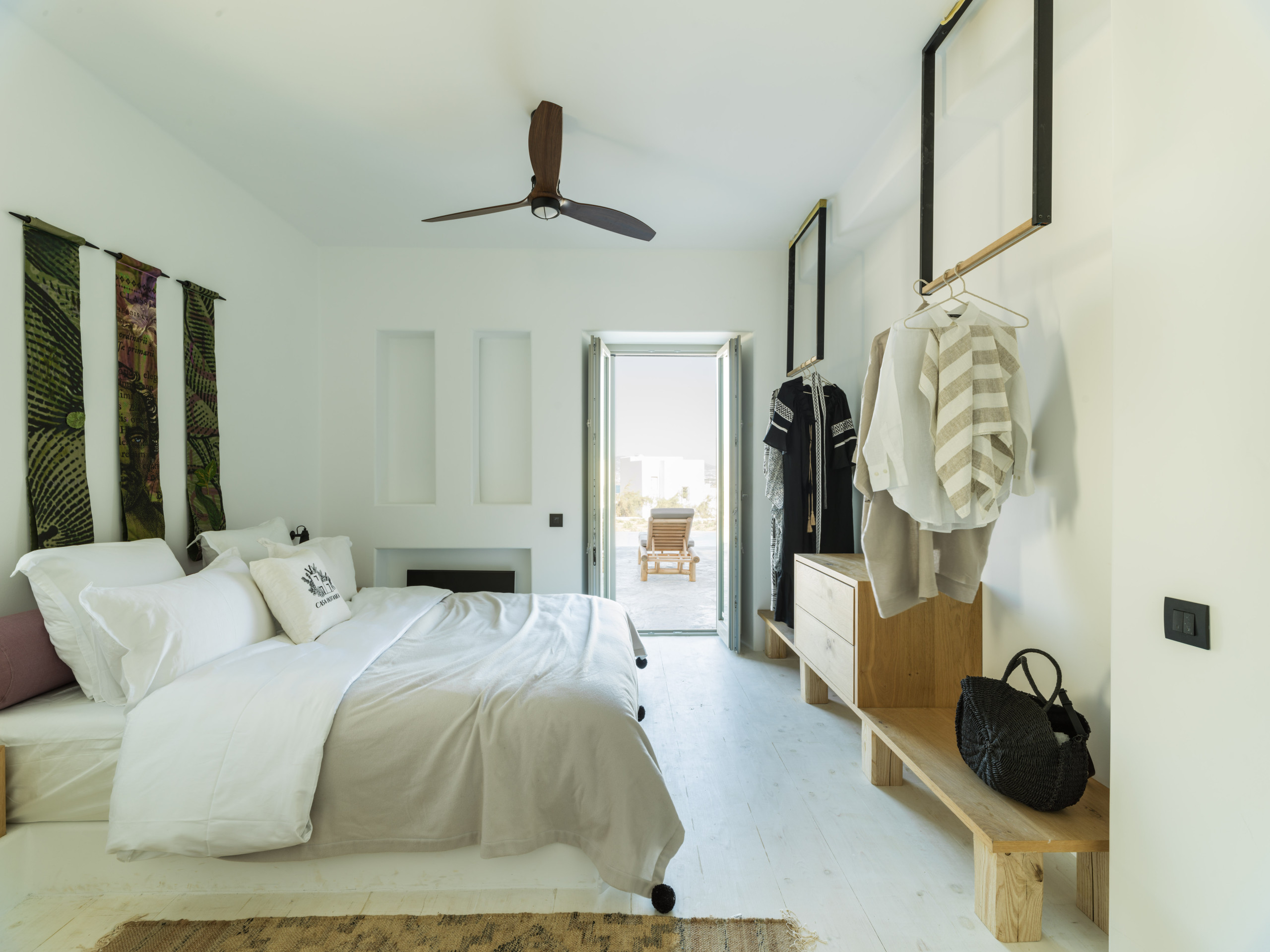 The villa features a bright living area opening onto spacious outdoor terraces with sun loungers and a private pool, perfect for relaxing under the Aegean sun. Both bedrooms are thoughtfully designed with ceiling fans, serene décor, premium COCO-MAT mattresses, and direct access to the outdoors, ensuring a restful sleep experience. A compact yet fully equipped kitchen makes meal preparation simple and convenient.