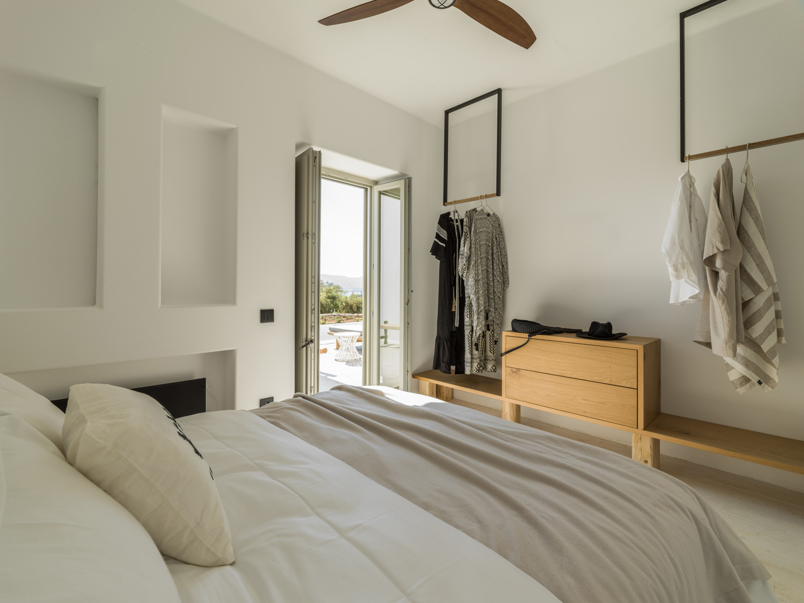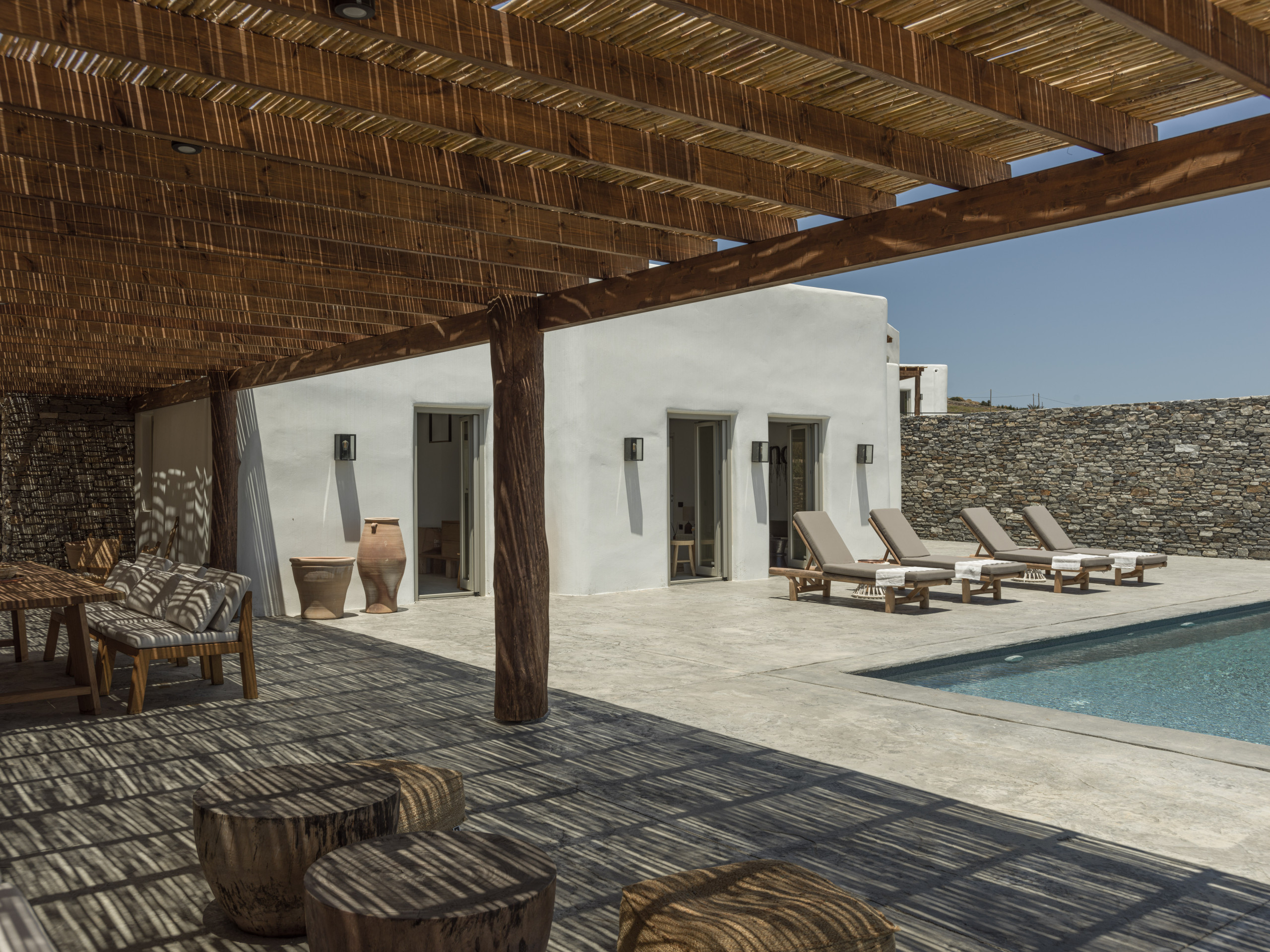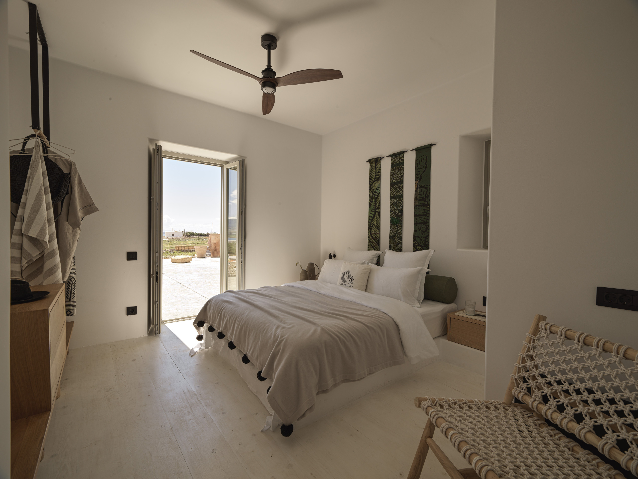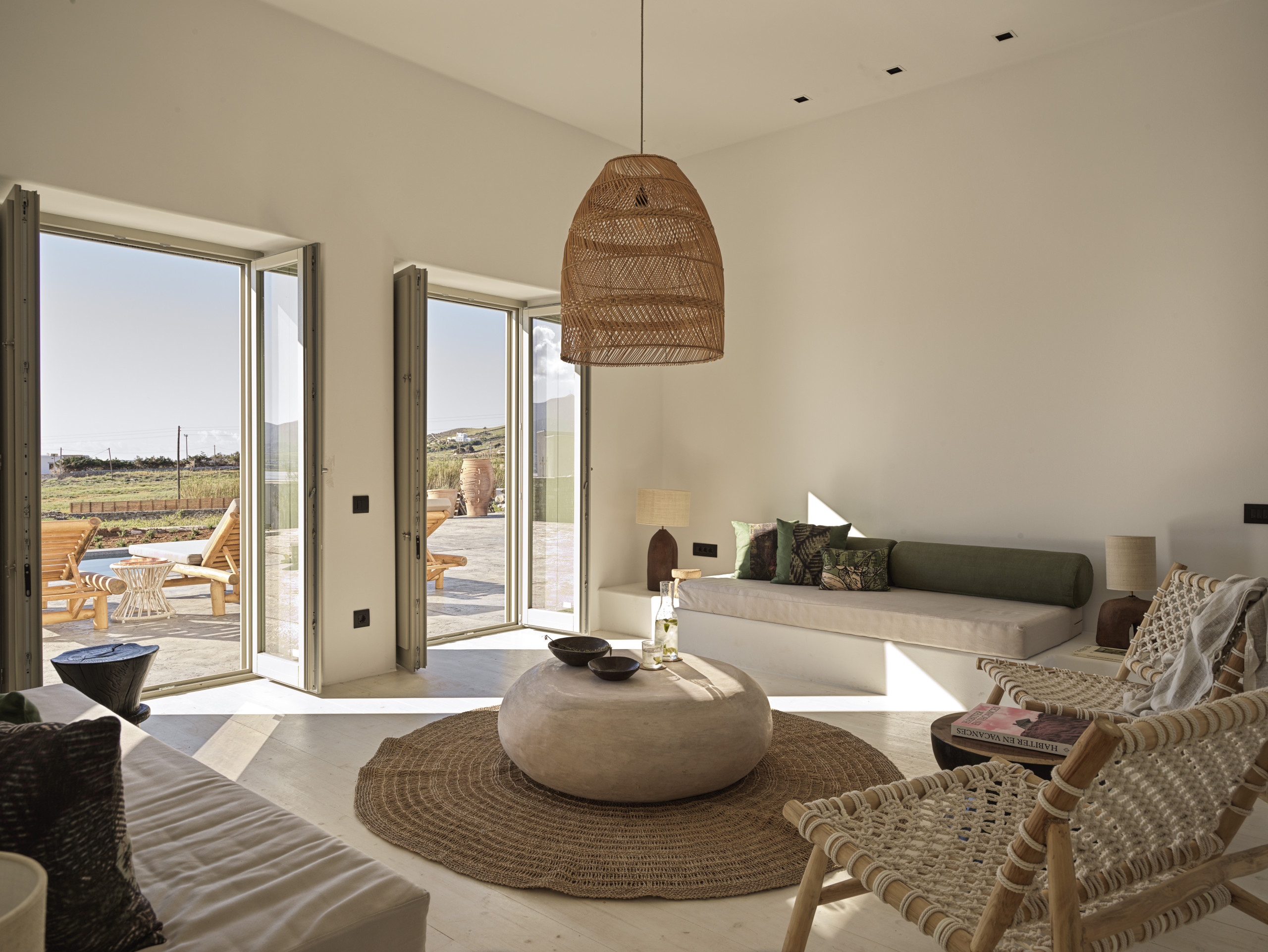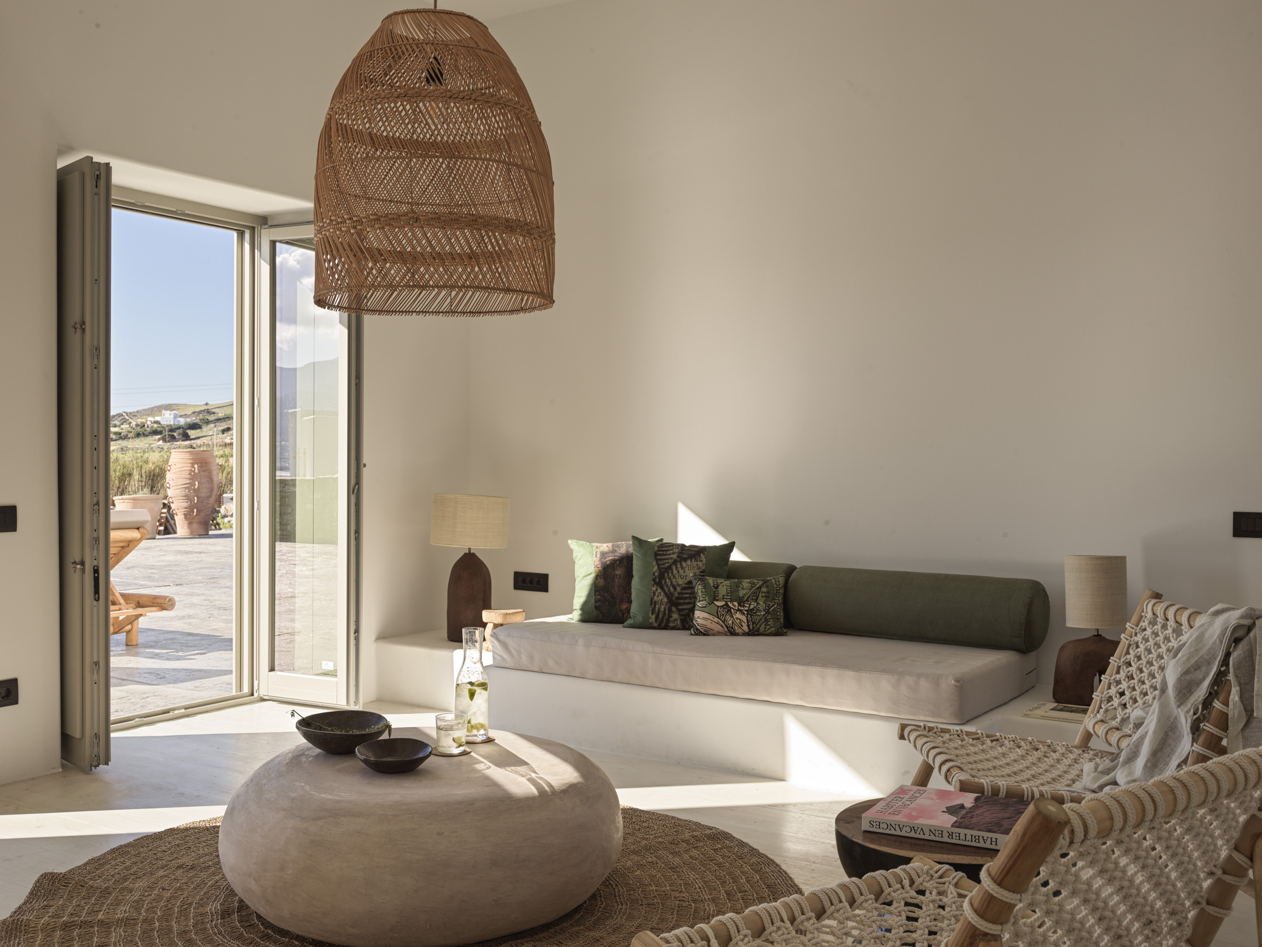 Sweet earthy tones, unpretentious elegance and modern bohemian aesthetics are harmoniously combined in the spaces of Avra residence. The refined decoration is complemented by the use of natural materials in furniture and lighting, such as wood and mat, as well as characteristic samples of Cycladic art, highlighted by the aesthetic lighting, which is evident in most rooms. In Avra you can enjoy plenty of spaces to rest, sleep and dine, relax in the hammock of the small private garden overlooking the ancient findings at Despotiko or take a dip in the pool while enjoying the fragrances of the local aromatic plants that dominate the area.