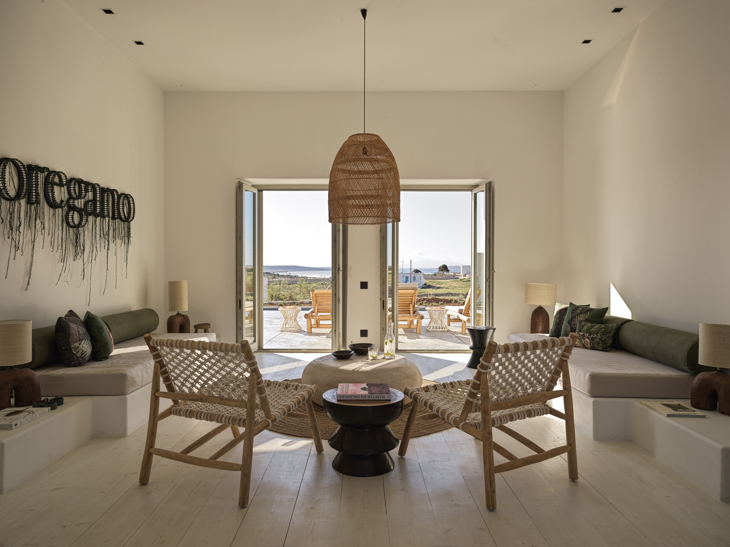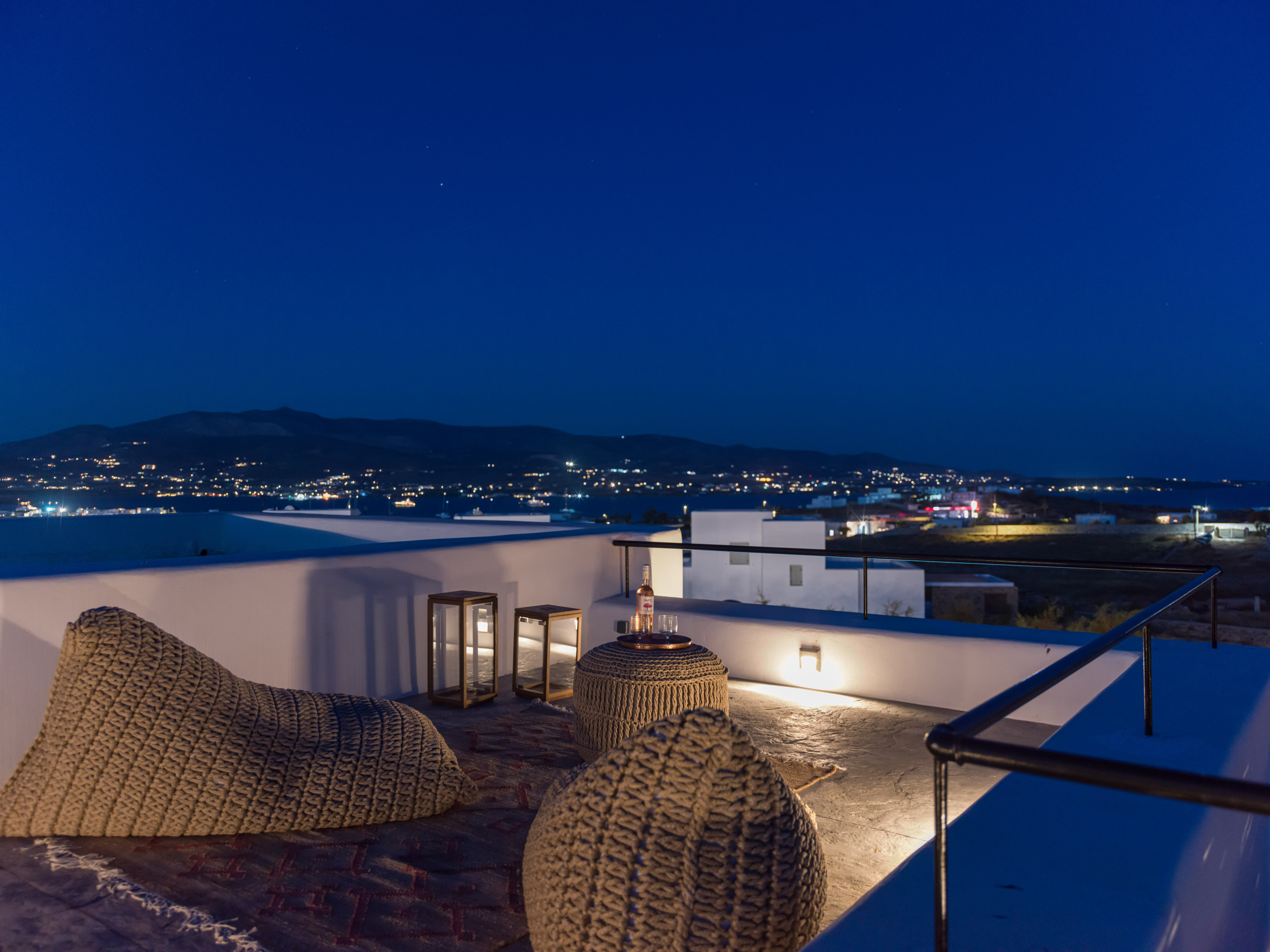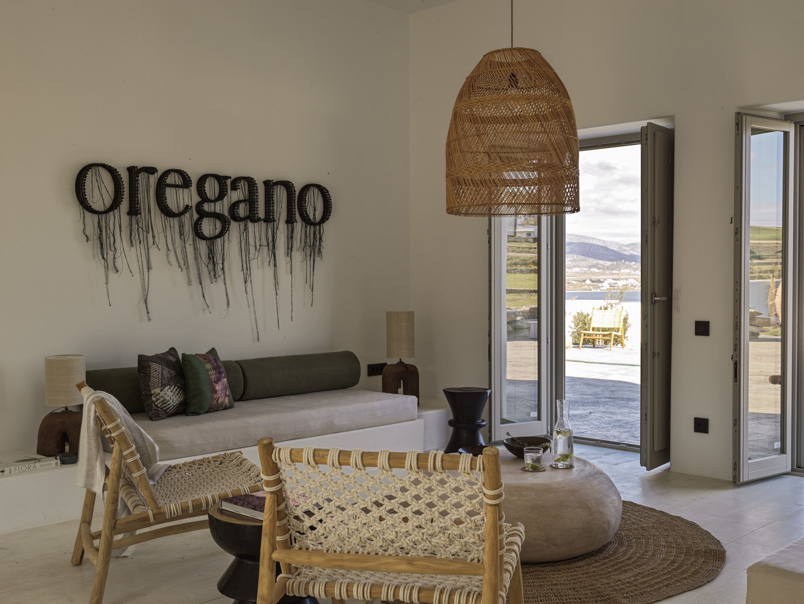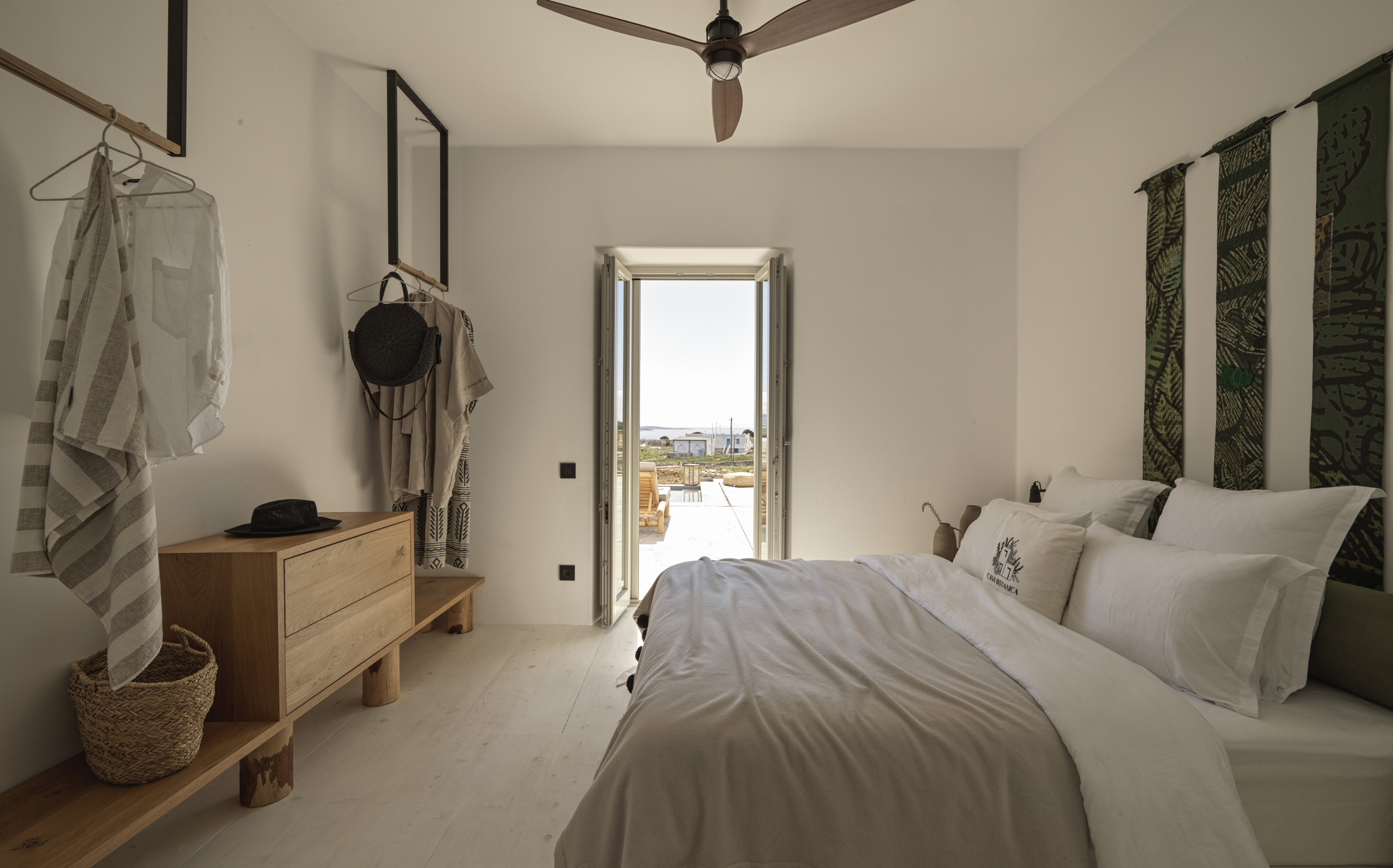 Sweet earthy tones, unpretentious elegance and modern bohemian aesthetics are harmoniously combined in the spaces of Avra residence. The refined decoration is complemented by the use of natural materials in furniture and lighting, such as wood and mat, as well as characteristic samples of Cycladic art, highlighted by the aesthetic lighting, which is evident in most rooms. In Avra you can enjoy plenty of spaces to rest, sleep and dine, relax in the hammock of the small private garden overlooking the ancient findings at Despotiko or take a dip in the pool while enjoying the fragrances of the local aromatic plants that dominate the area.