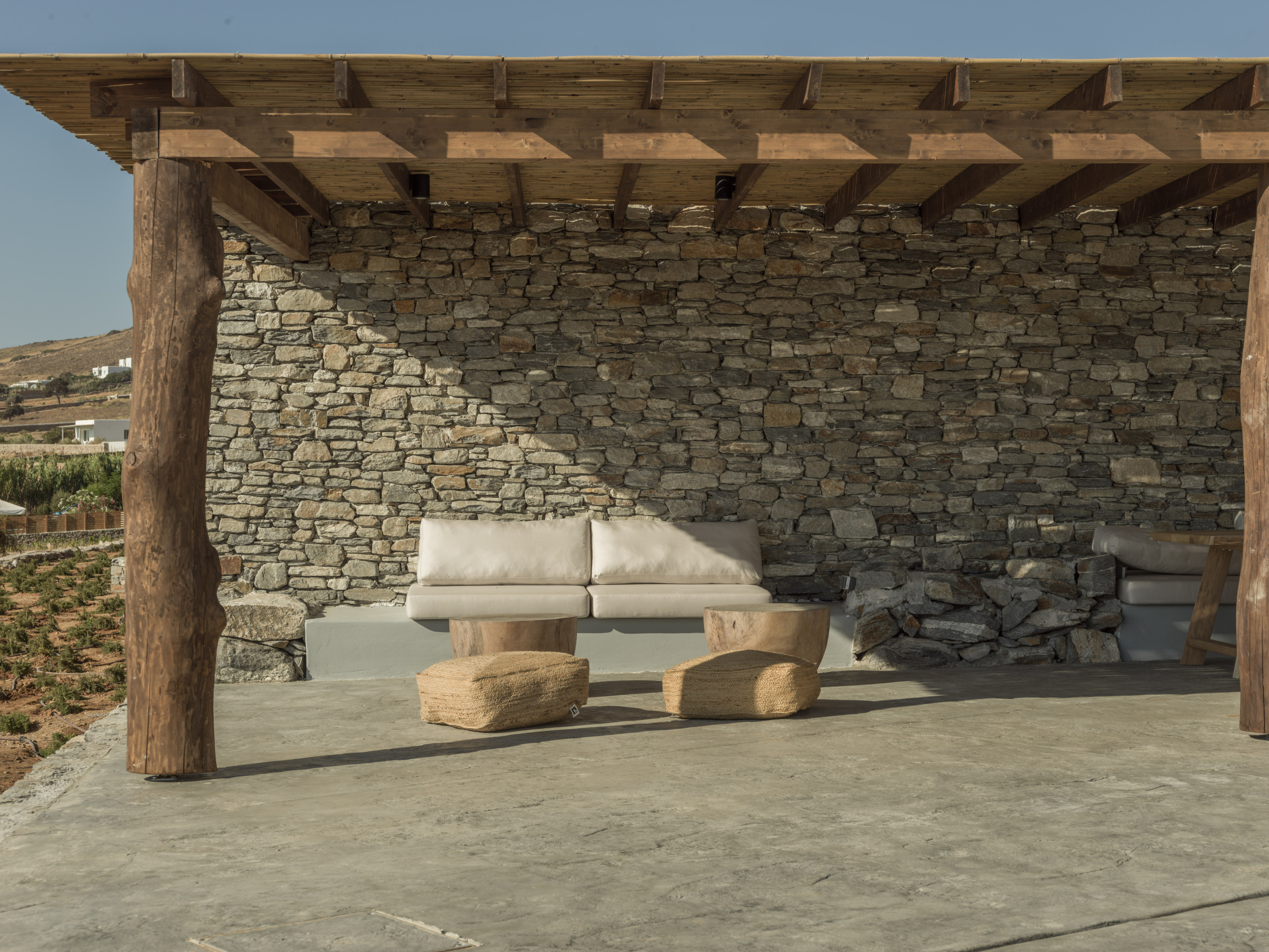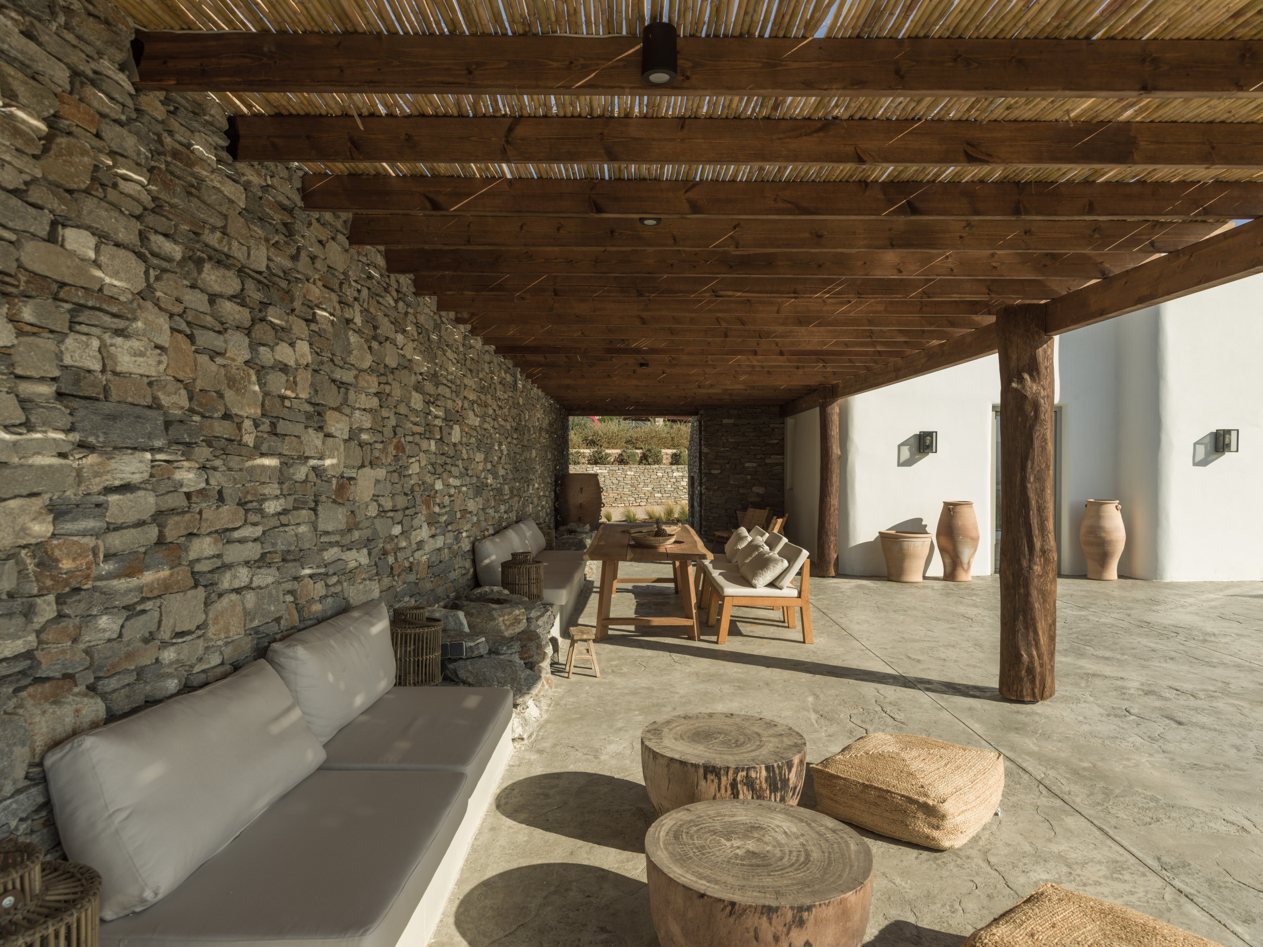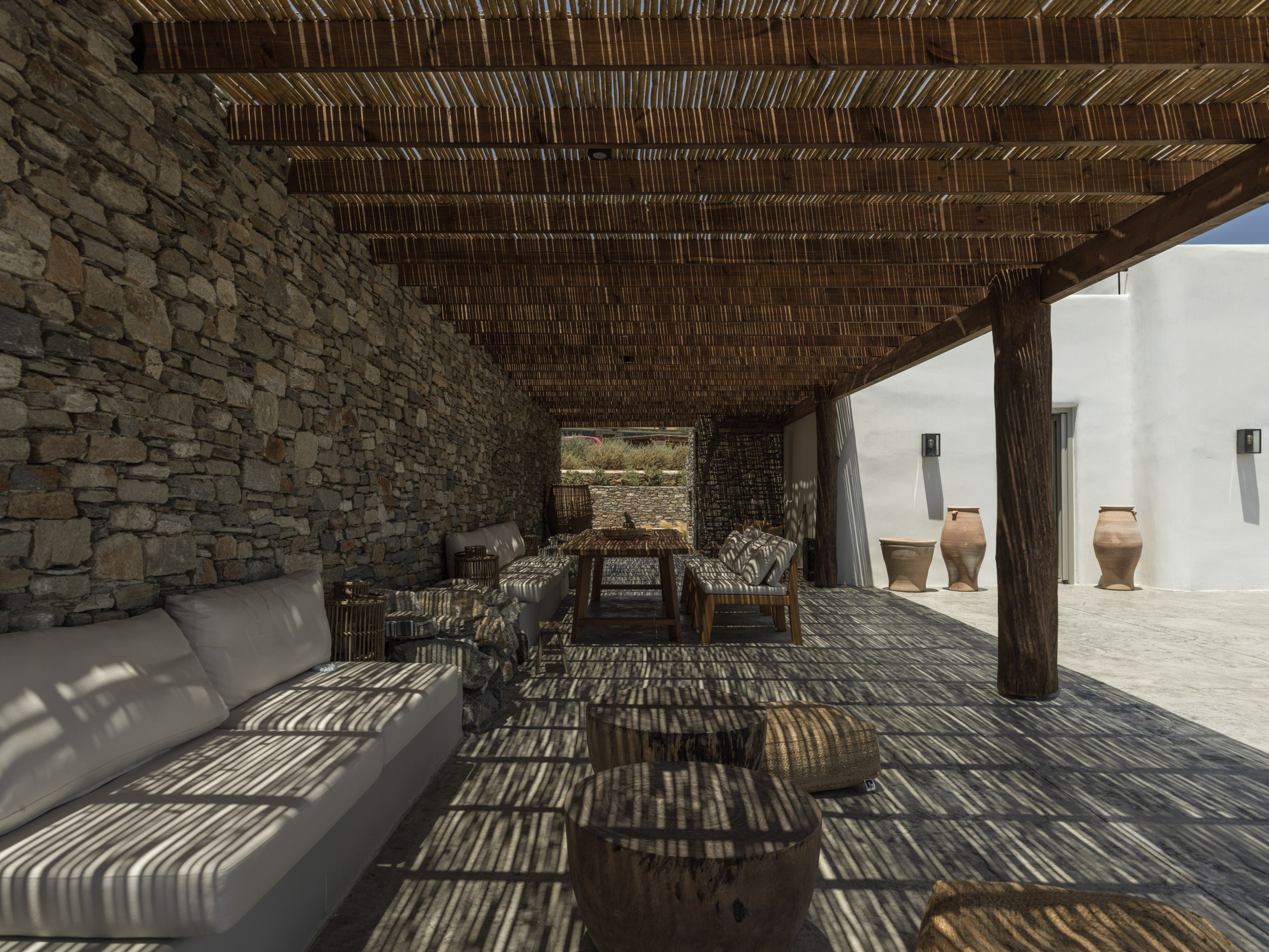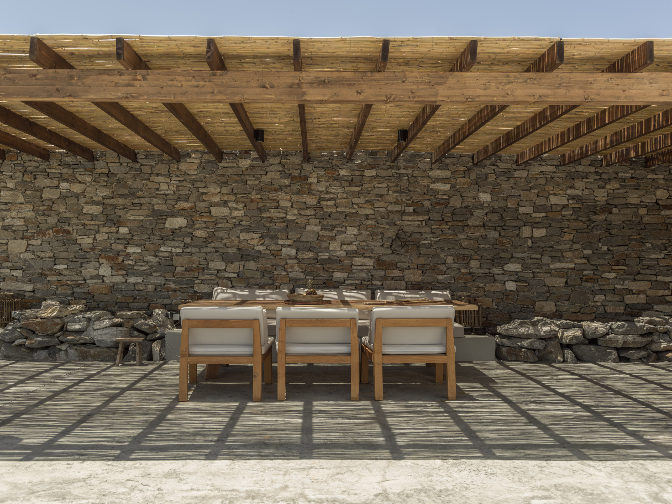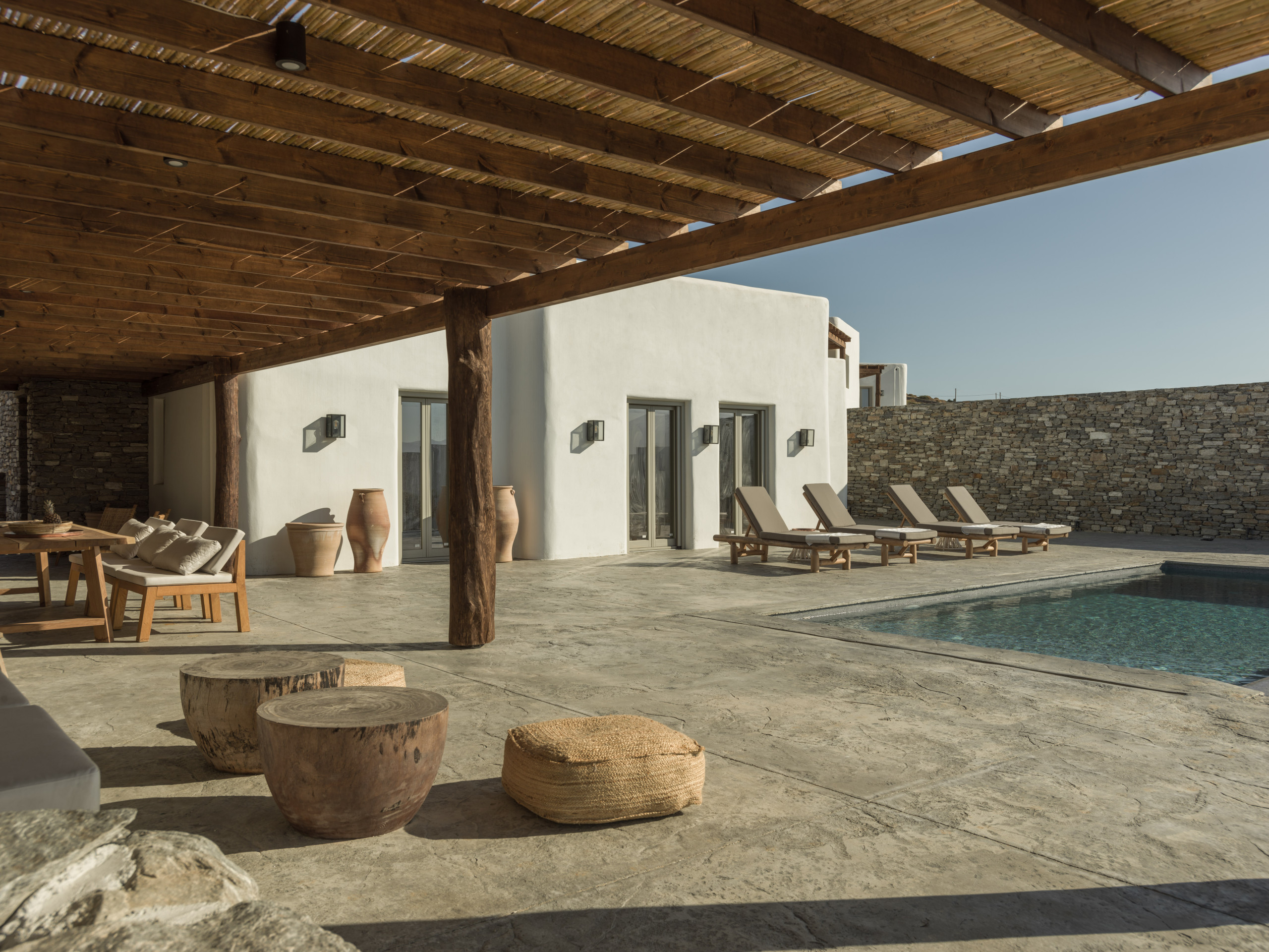 Sweet earthy tones, unpretentious elegance and modern bohemian aesthetics are harmoniously combined in the spaces of Avra residence. The refined decoration is complemented by the use of natural materials in furniture and lighting, such as wood and mat, as well as characteristic samples of Cycladic art, highlighted by the aesthetic lighting, which is evident in most rooms. In Avra you can enjoy plenty of spaces to rest, sleep and dine, relax in the hammock of the small private garden overlooking the ancient findings at Despotiko or take a dip in the pool while enjoying the fragrances of the local aromatic plants that dominate the area.