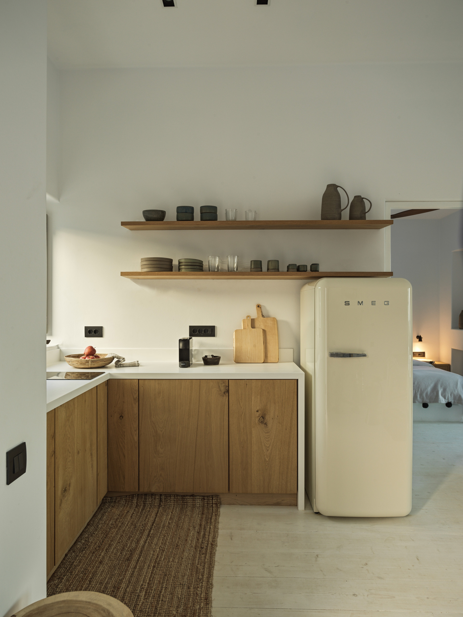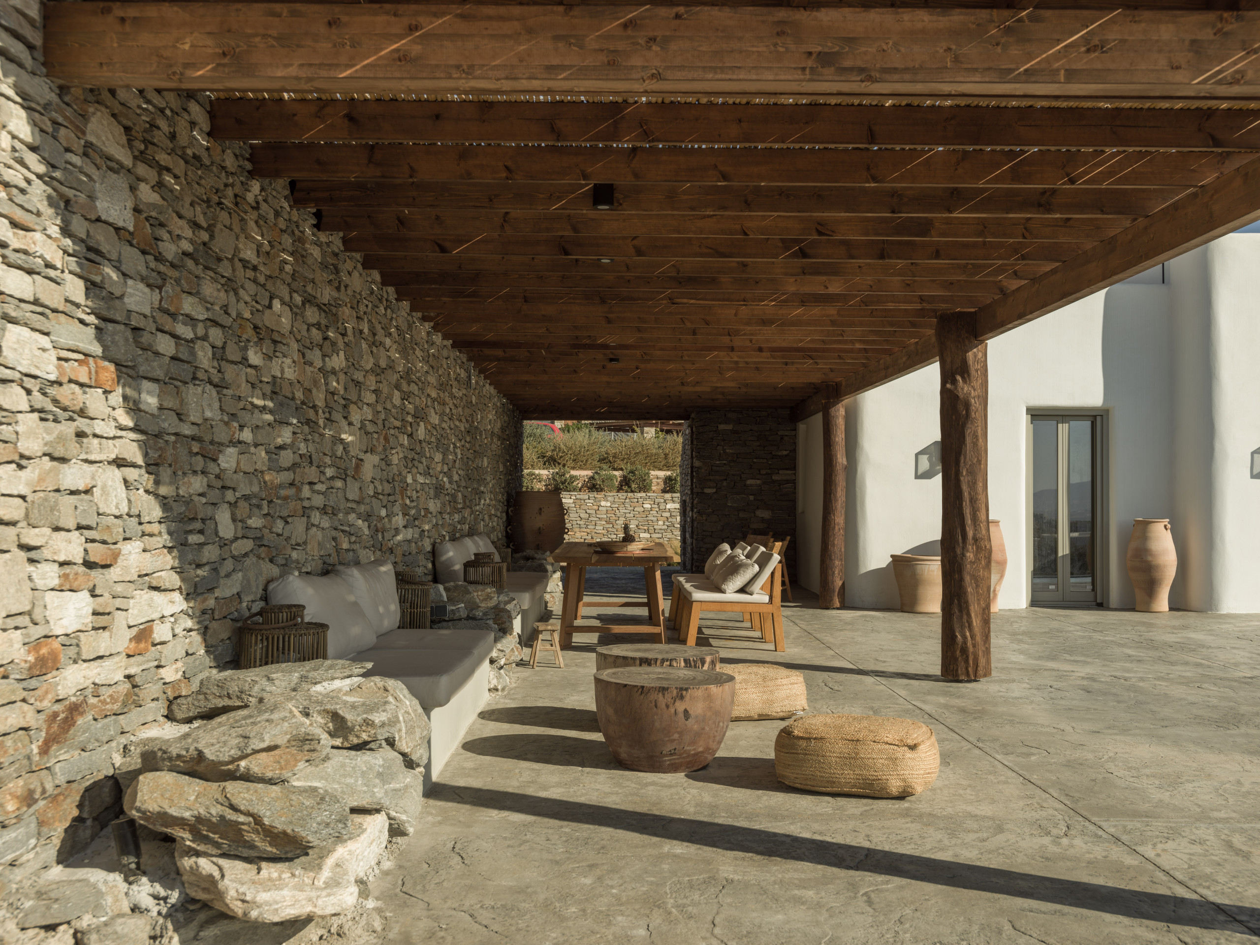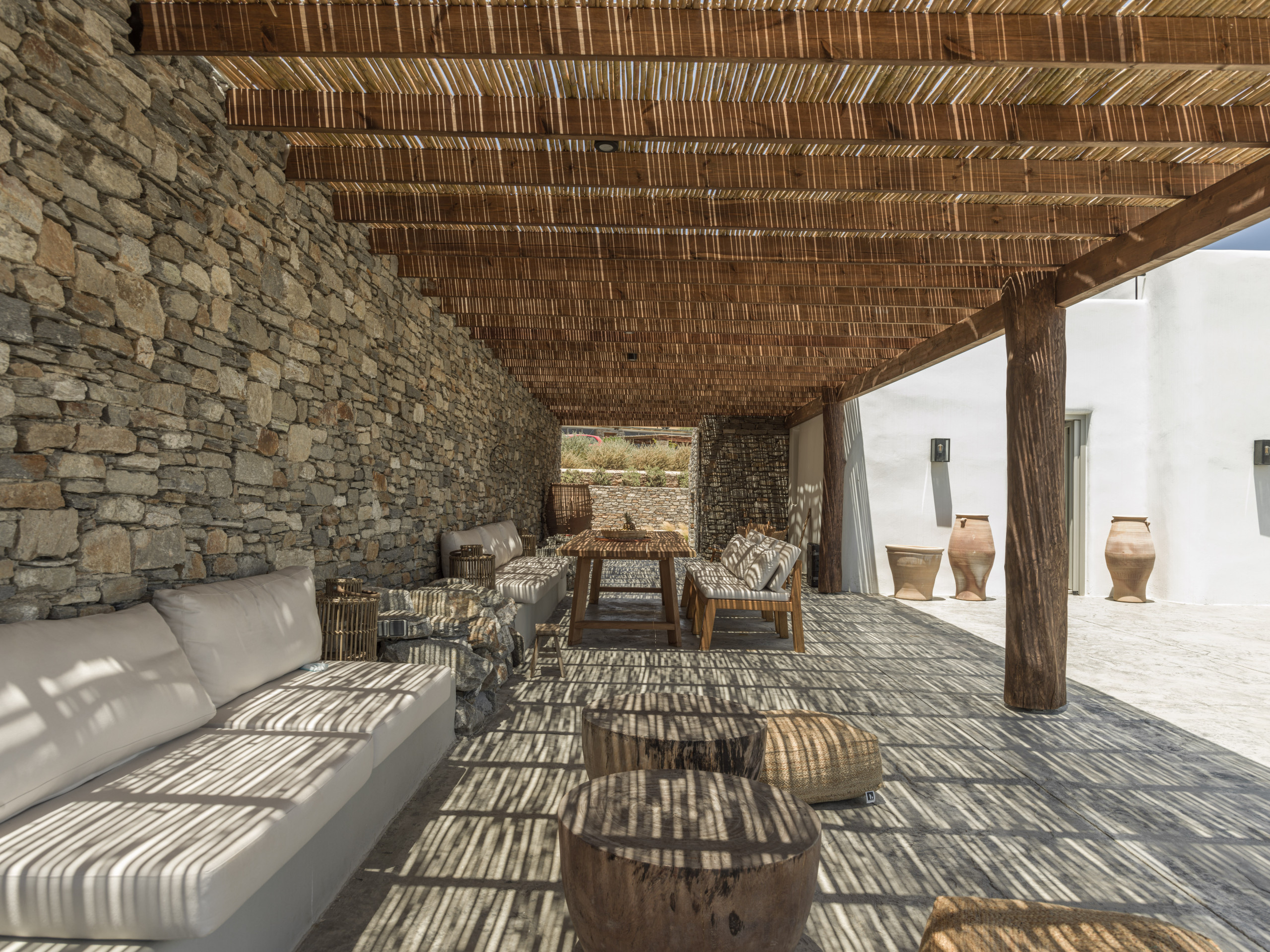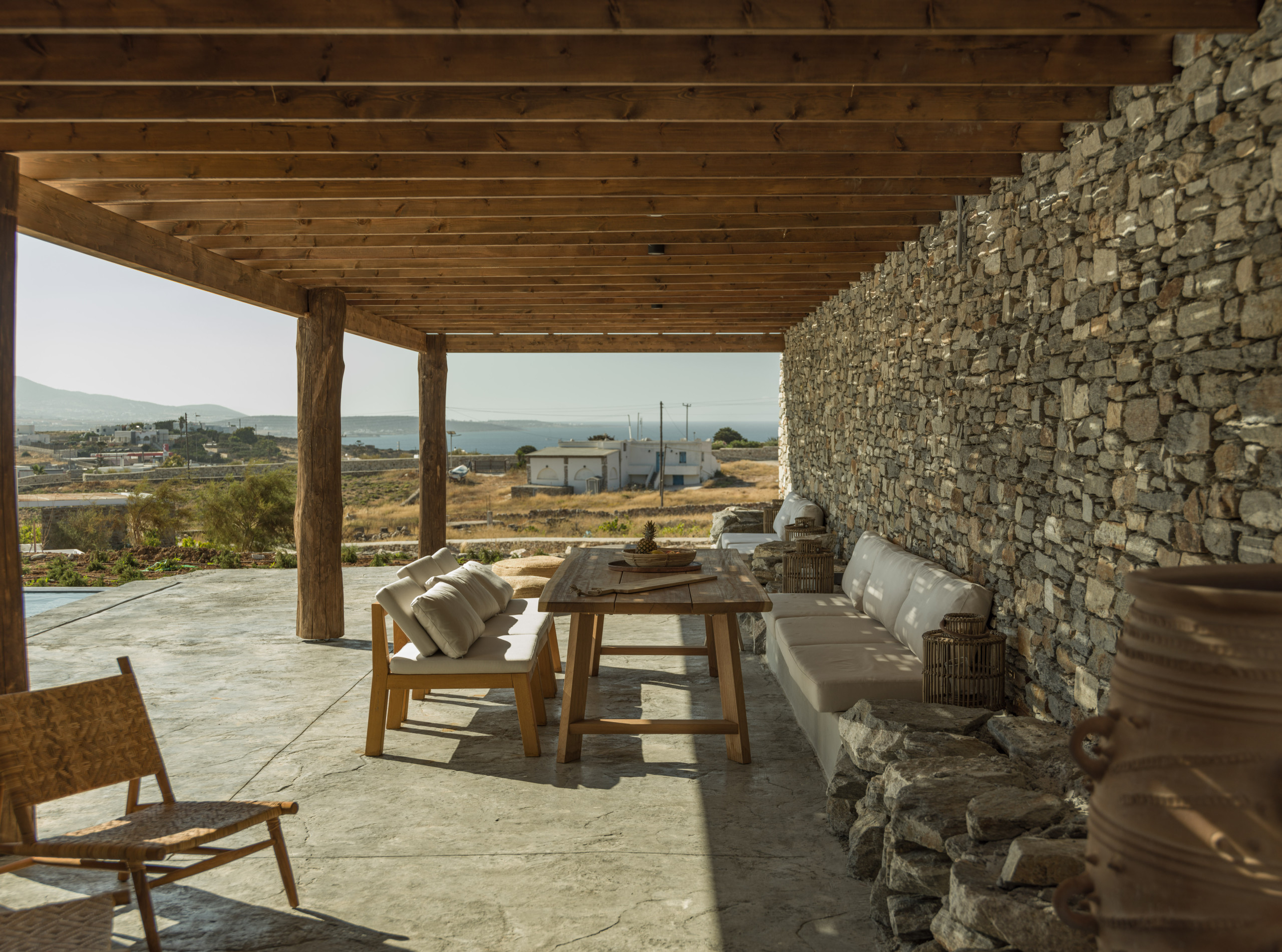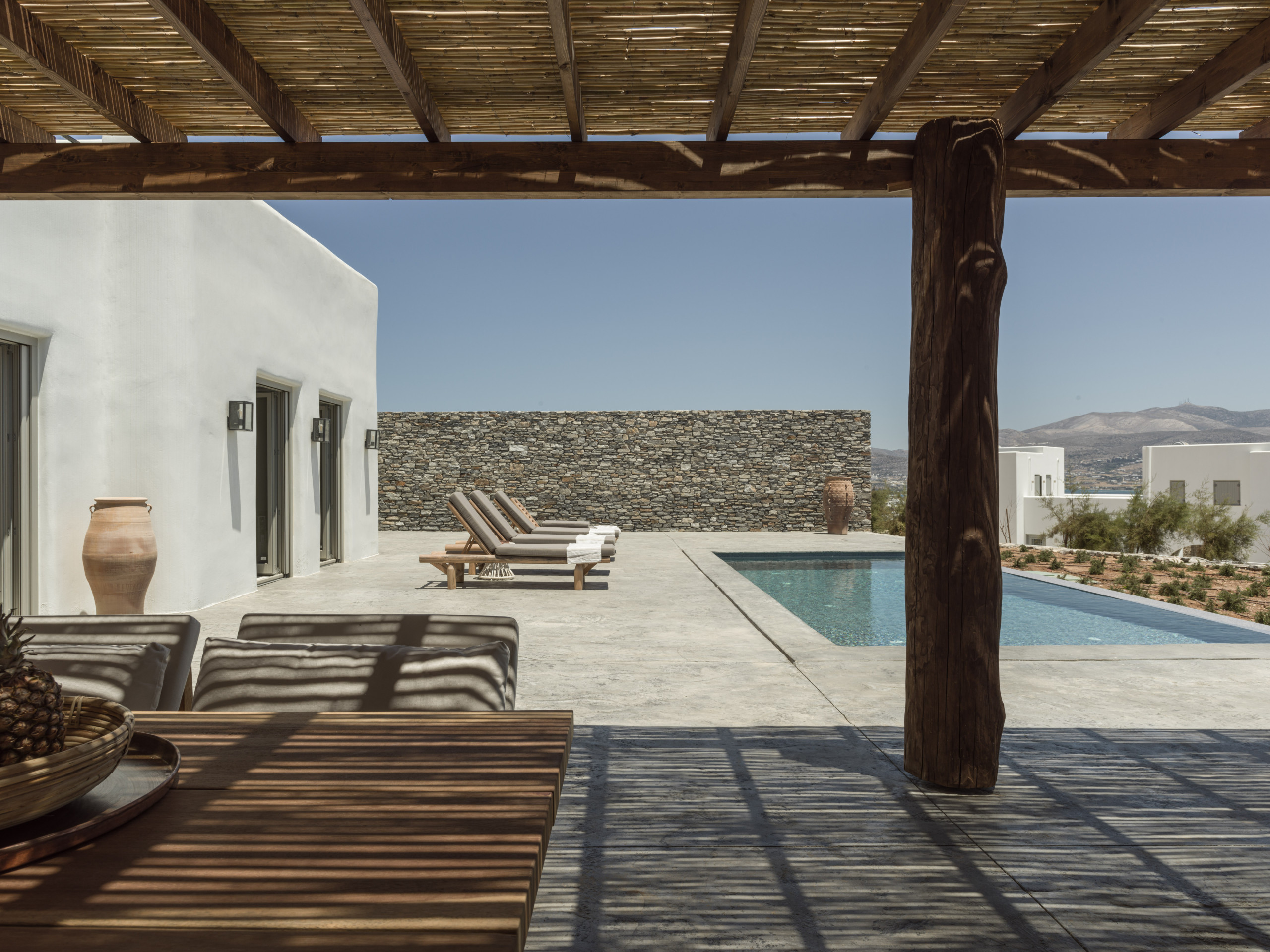 Sweet earthy tones, unpretentious elegance and modern bohemian aesthetics are harmoniously combined in the spaces of Avra residence. The refined decoration is complemented by the use of natural materials in furniture and lighting, such as wood and mat, as well as characteristic samples of Cycladic art, highlighted by the aesthetic lighting, which is evident in most rooms. In Avra you can enjoy plenty of spaces to rest, sleep and dine, relax in the hammock of the small private garden overlooking the ancient findings at Despotiko or take a dip in the pool while enjoying the fragrances of the local aromatic plants that dominate the area.