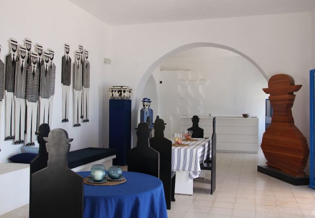 The interiors are infused with Gaïtis’ artistic spirit. Original paintings, sculptures, prints, and bespoke furniture signed by the artist enrich many of the rooms, particularly the expansive upper living area, creating a living gallery where art, architecture, and everyday life blend seamlessly. This is not a standard rental, but a place to slow down, disconnect, and experience a true summer retreat, where there is no need for a car or television, and even groceries can be delivered by boat directly to the cove below the villa.