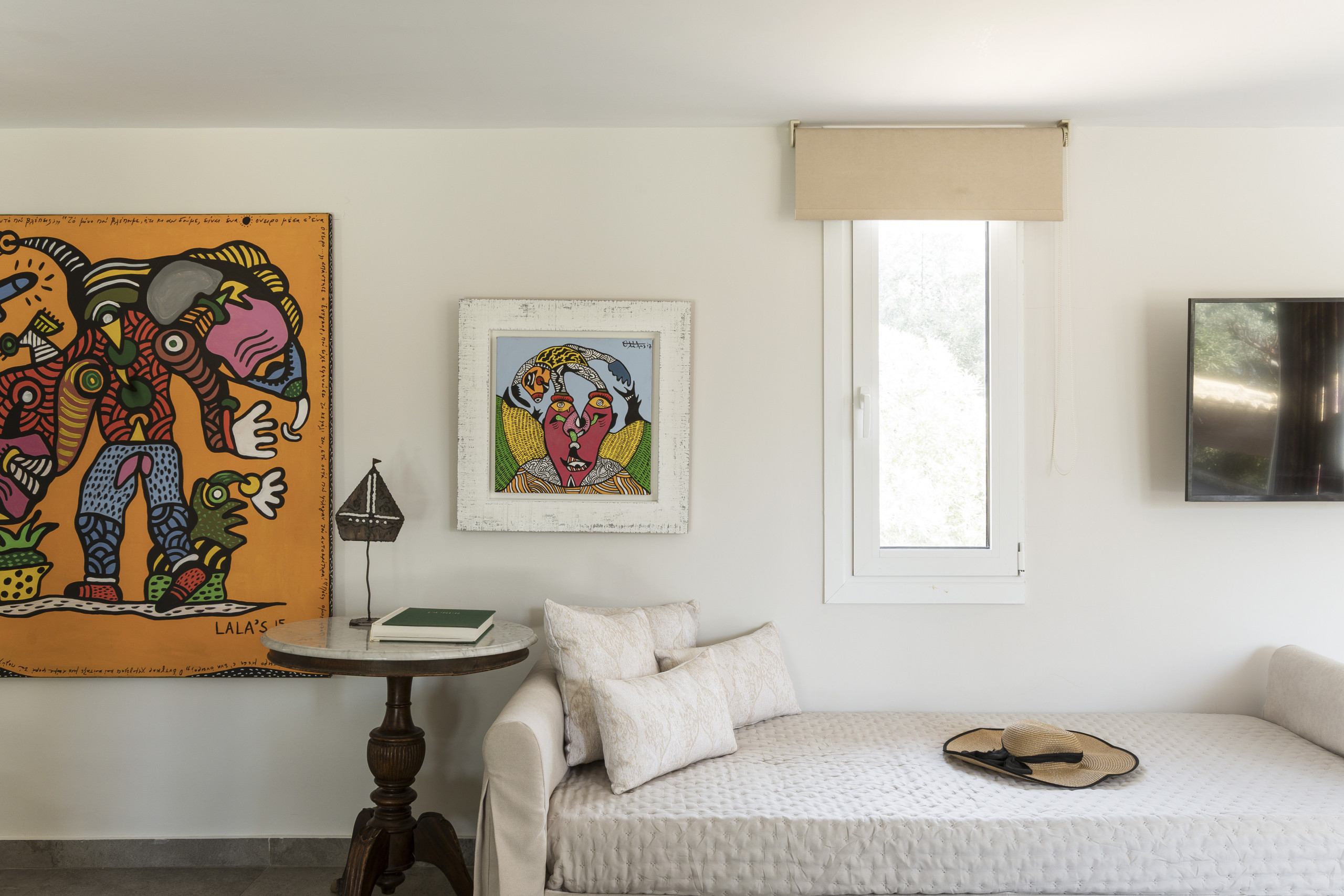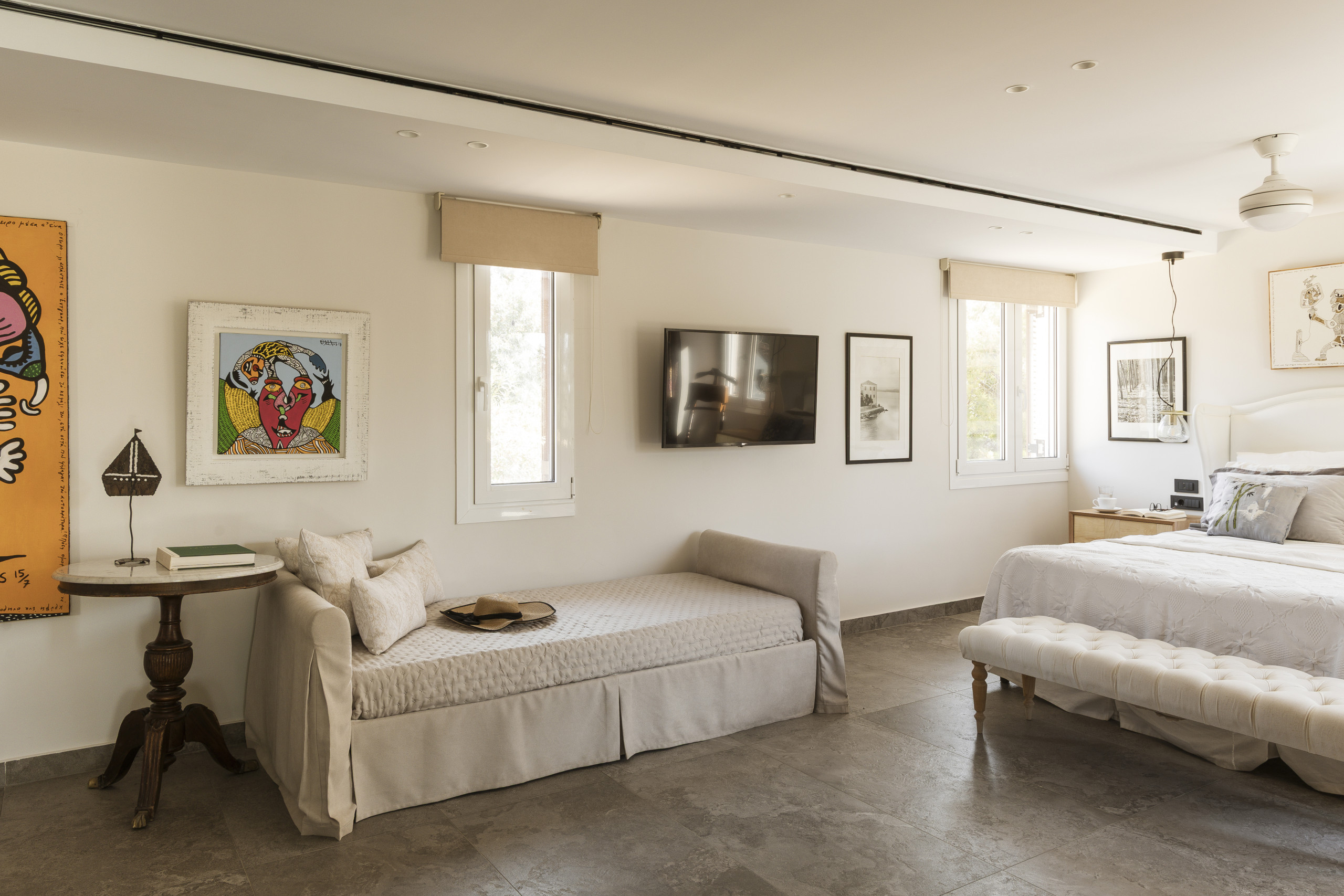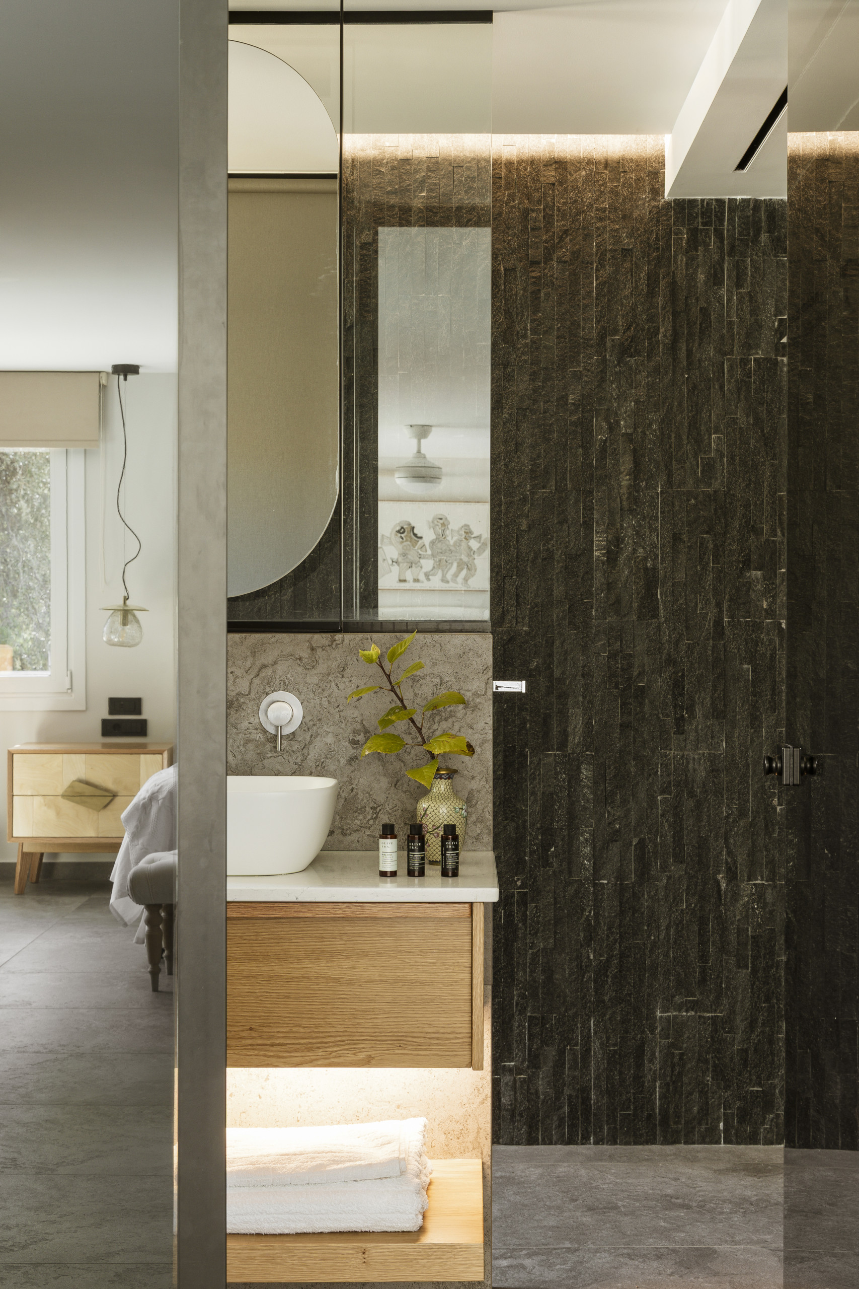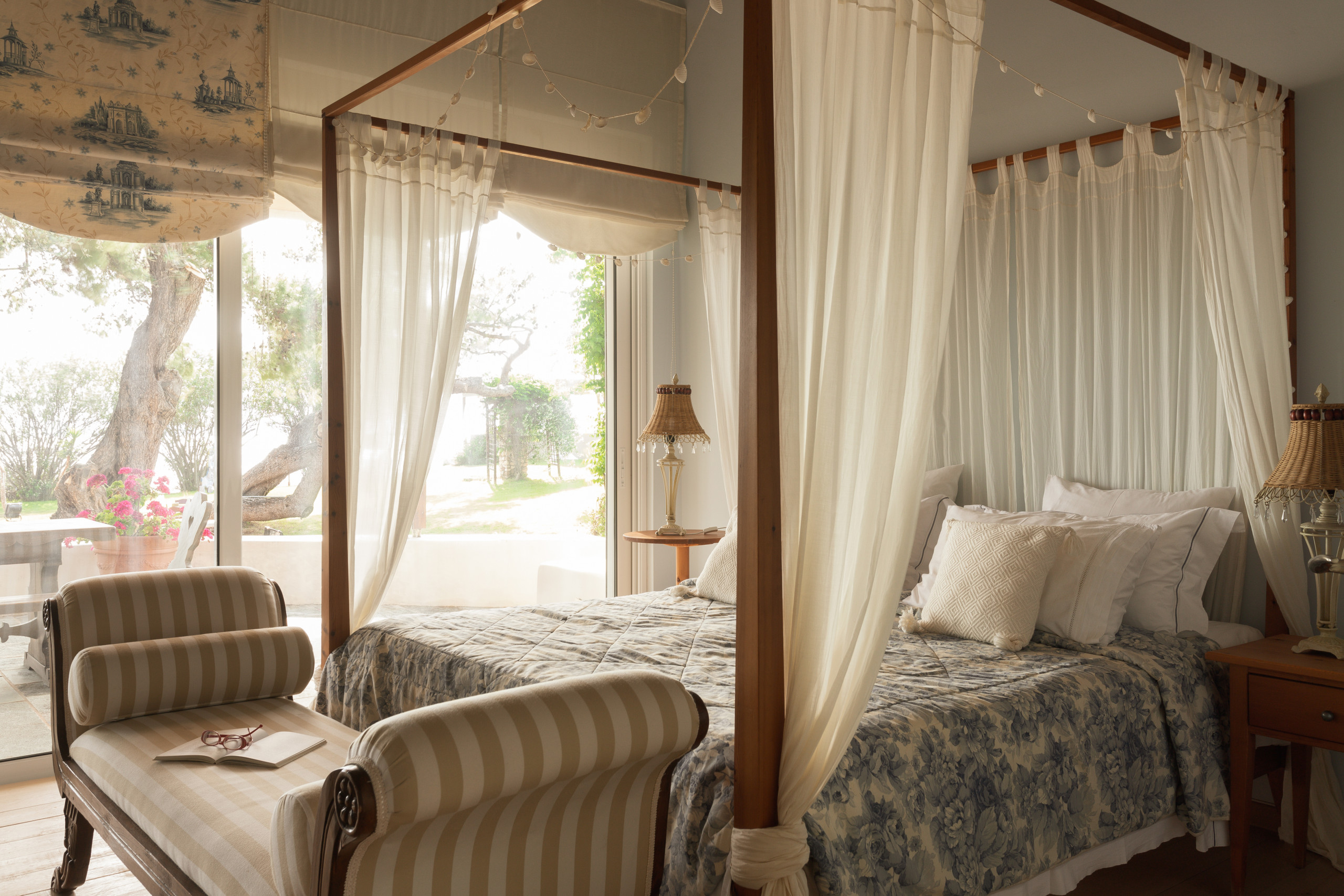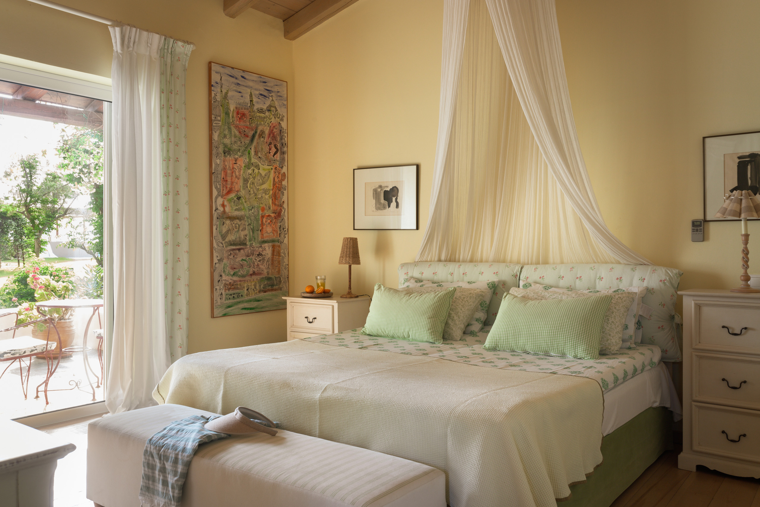The villa is layered like a story. Below, cool and calm, bedrooms open onto the garden, private, restful, close to the earth. Above, a room touches the sky, its balcony suspended between sea and silence. Around the villa, independent guest suites offer their own rhythm, intimate spaces where each morning begins with a view of water and sky.