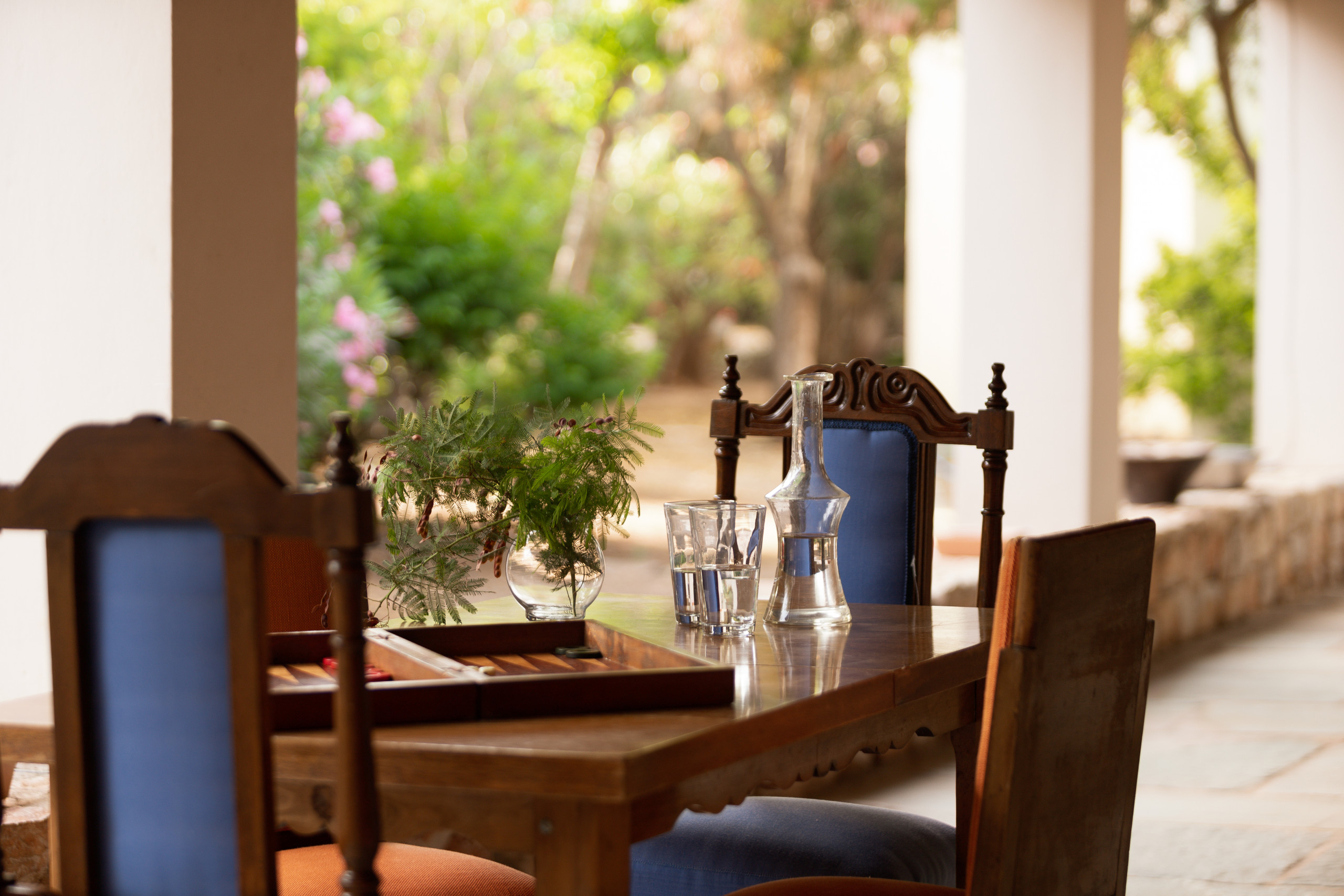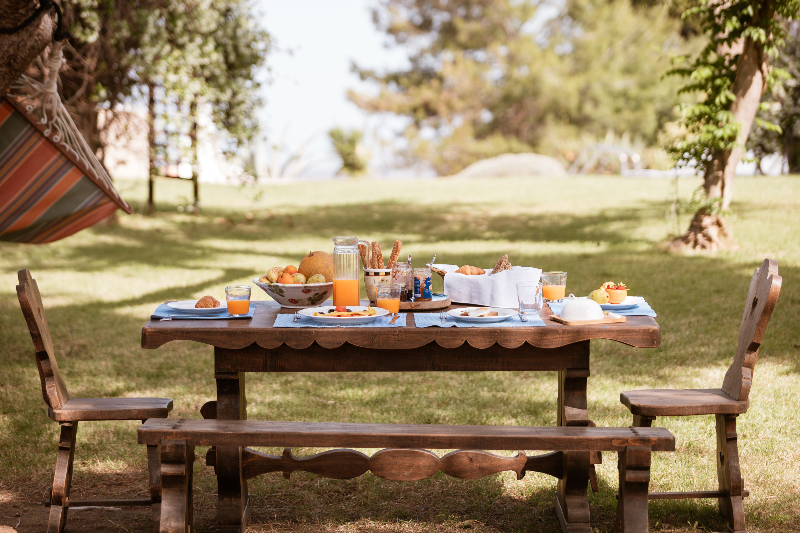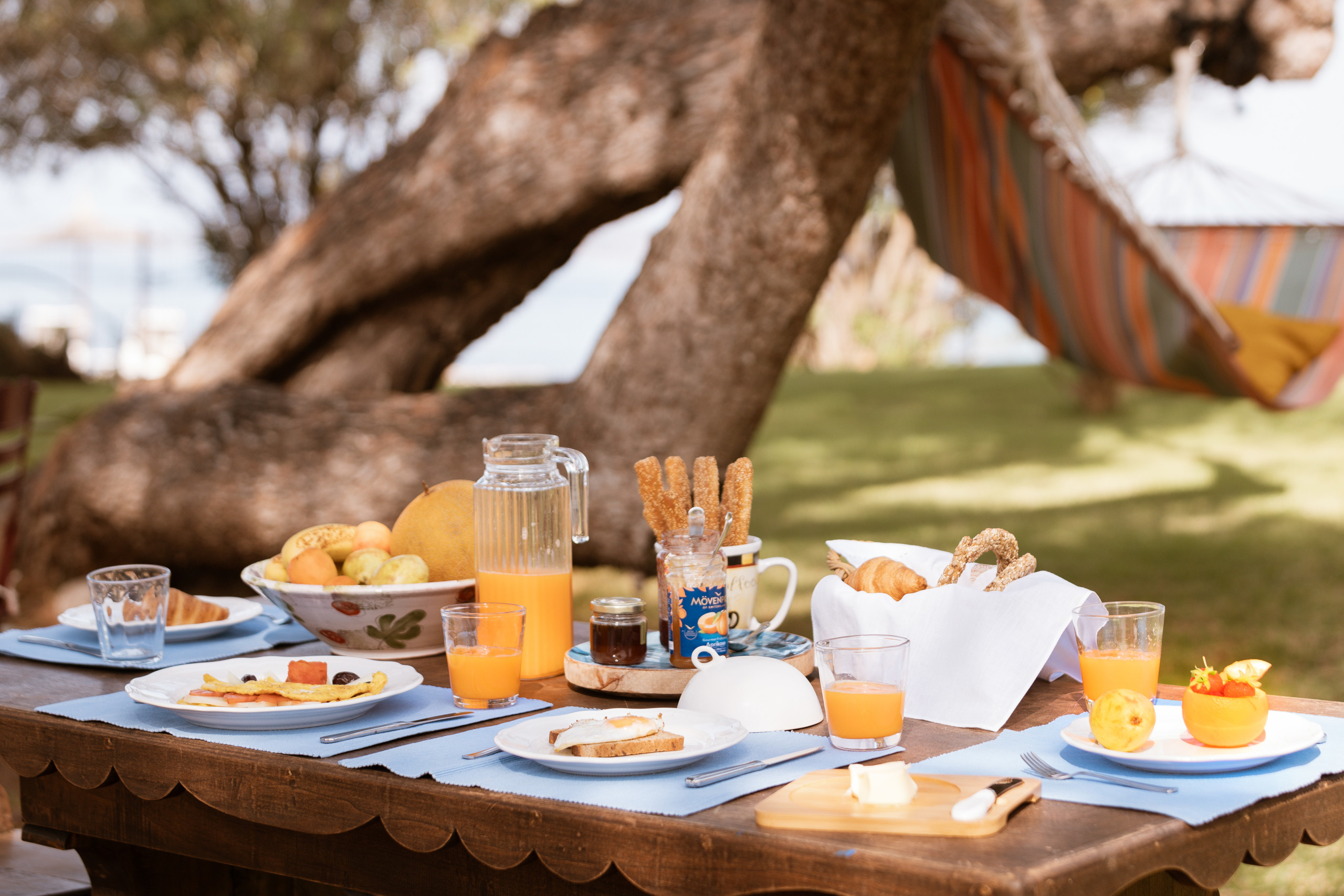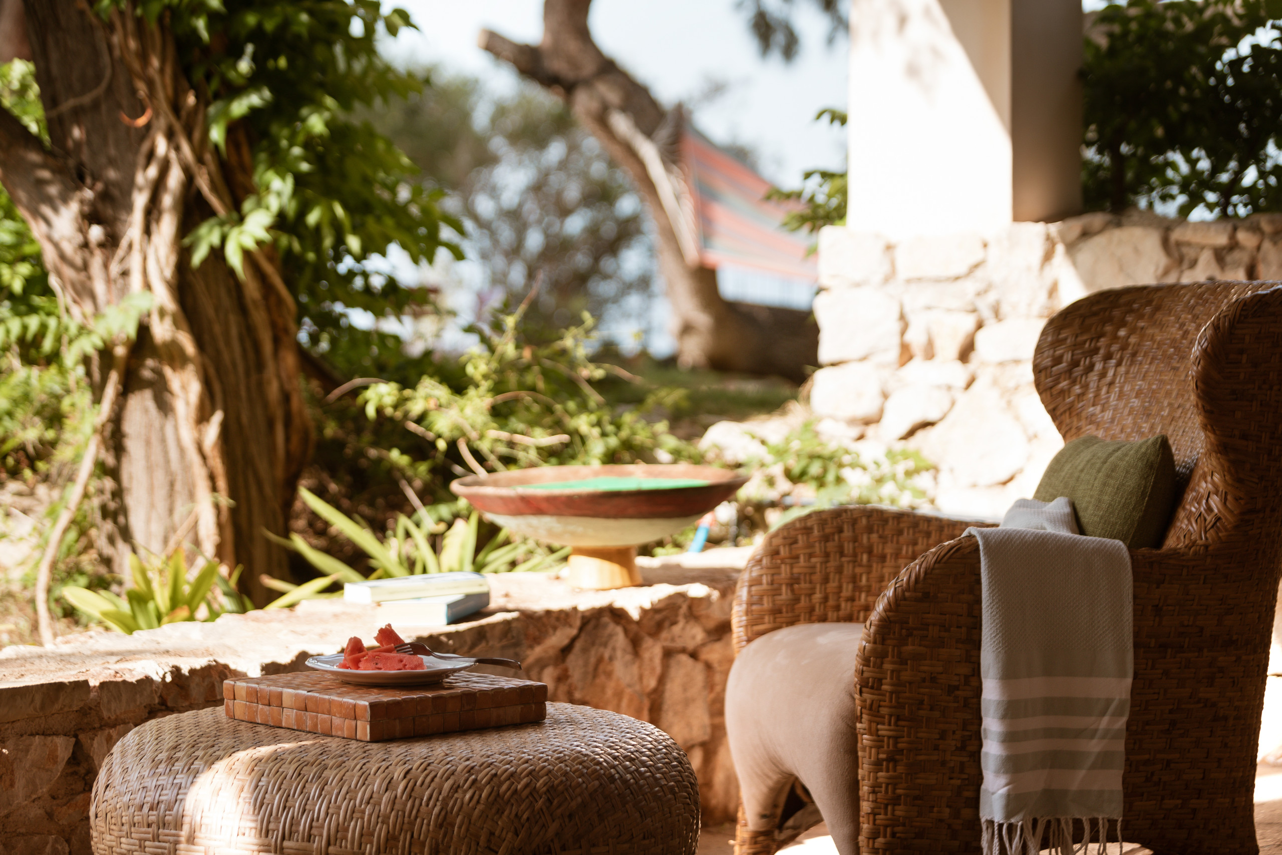 Outside is where time softens. The pool mirrors the blue beyond, framed by palms and stone. A hammock sways in the quiet hours. Shaded lounges invite long conversations, slow lunches, and the gentle luxury of doing nothing at all.
