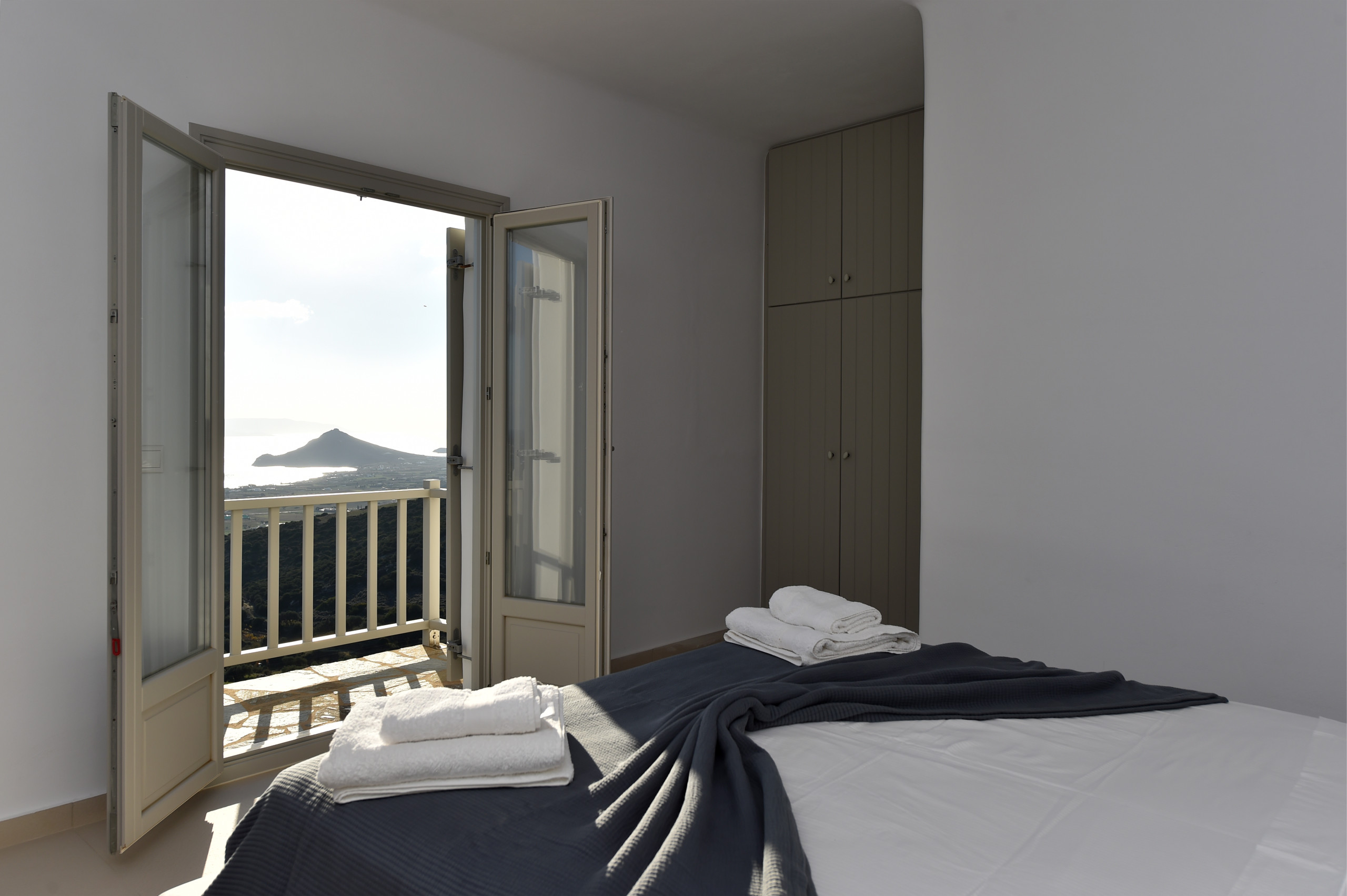 The villa's four spacious double bedrooms, tastefully decorated and offering ample storage, feature king and queen-sized beds. The open-plan living, dining, and kitchen area provides stunning views of Paros and the Aegean, with comfy sofas and an additional reception area. The fully equipped modern kitchen caters to your every need.