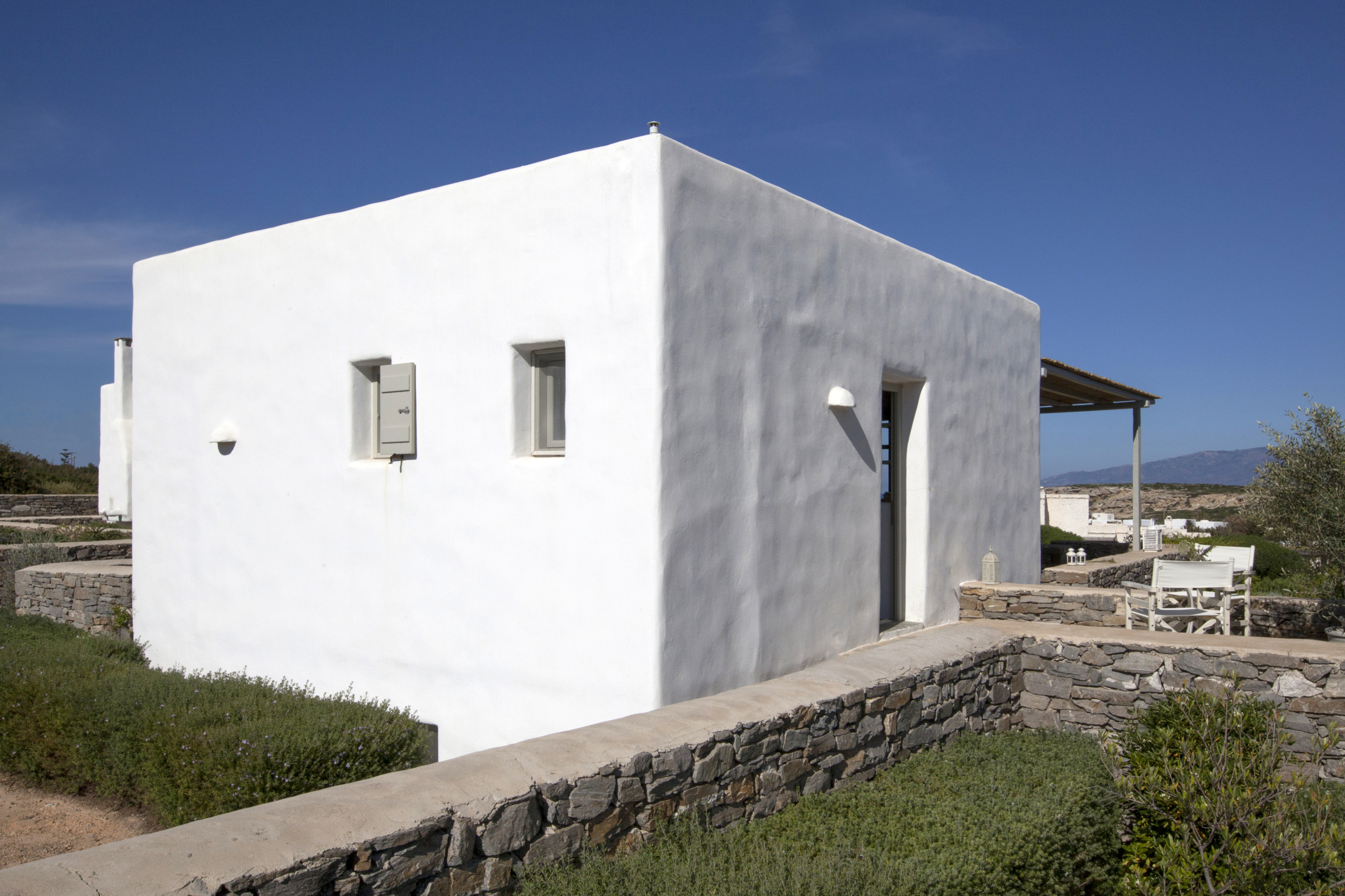 It has large shaded terrace with fabulous sea views which is ideal for al fresco meals or evening cocktails with the moon and the lights from Naxos island flickering across the sea.